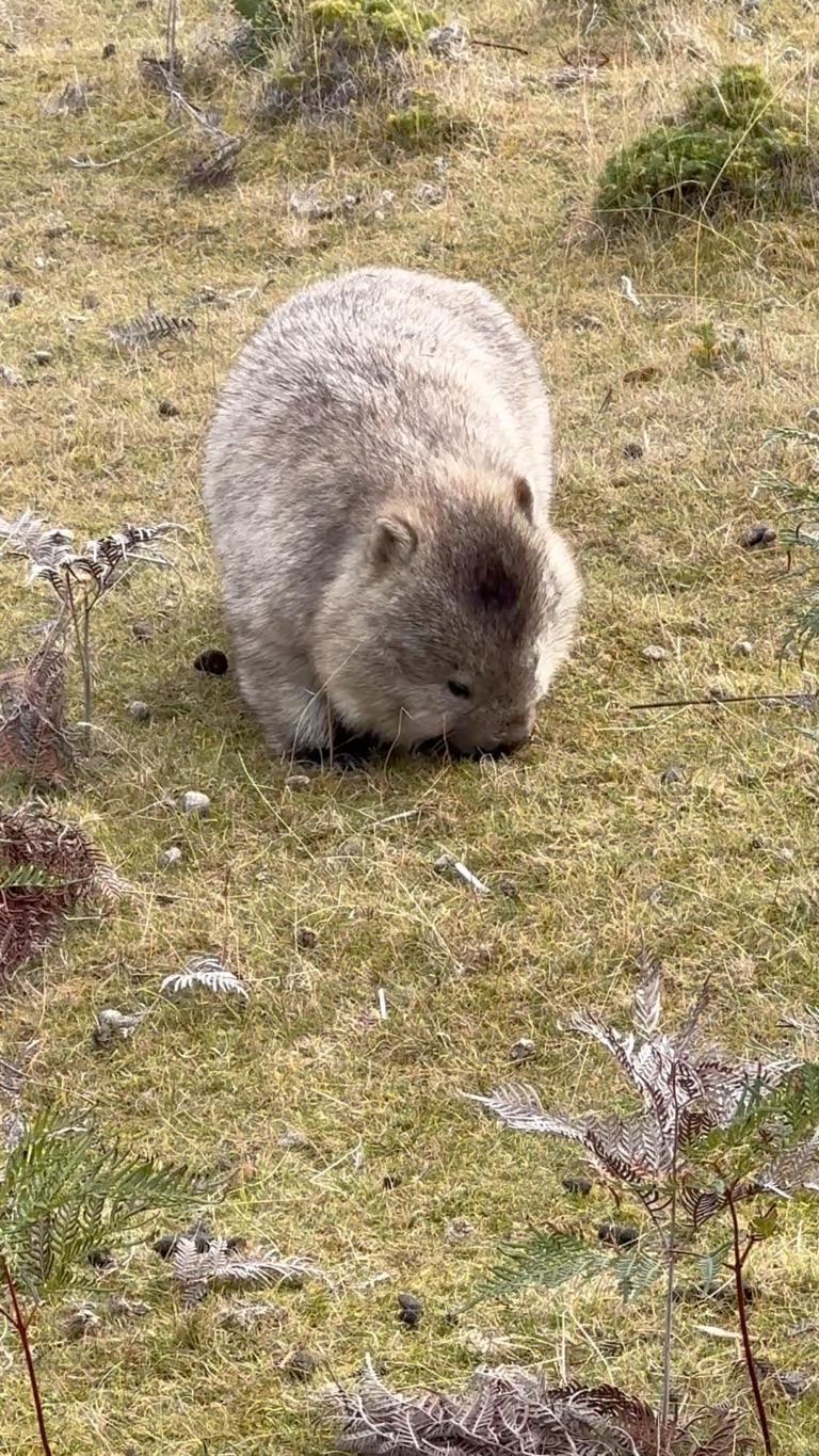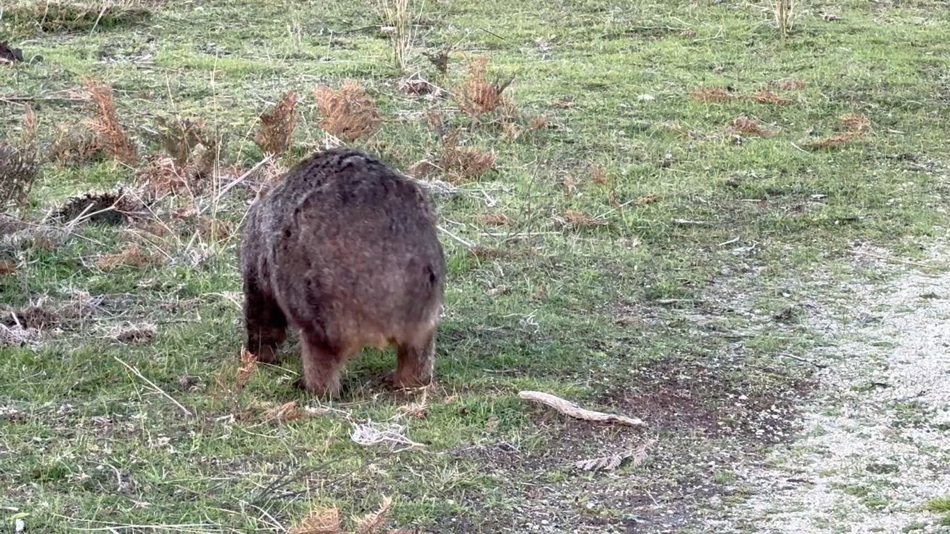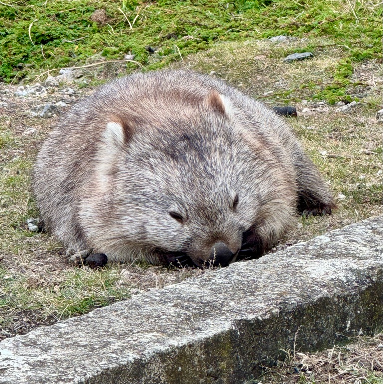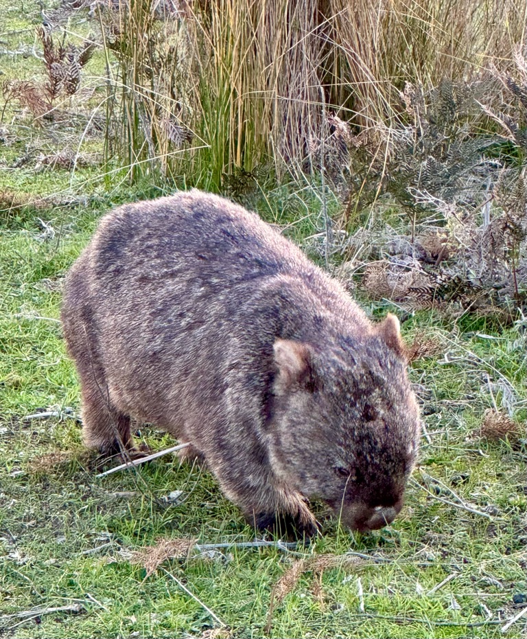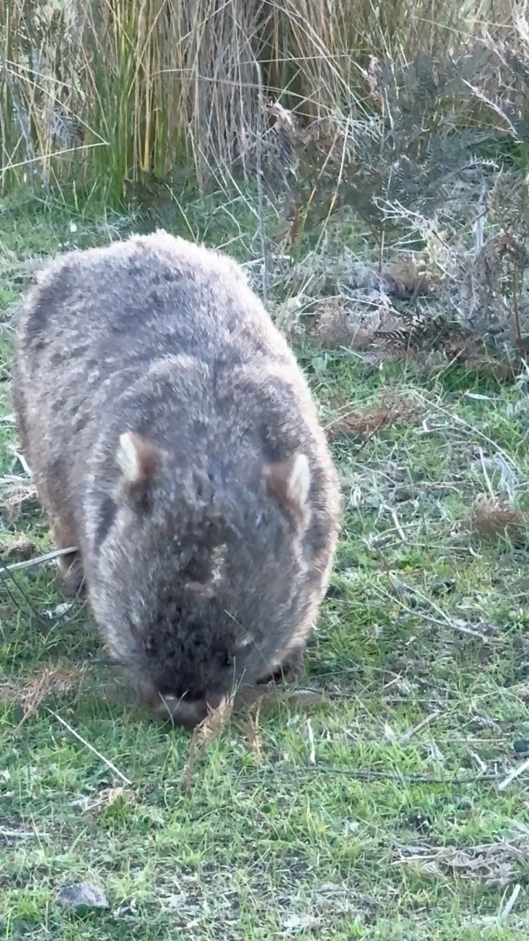 This wombat is less tired, very busy eating grass.The island looks like its been mowed thanks to these guys