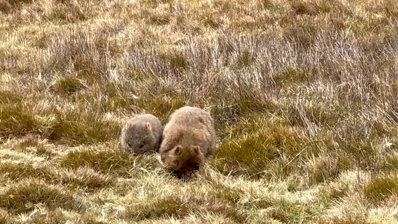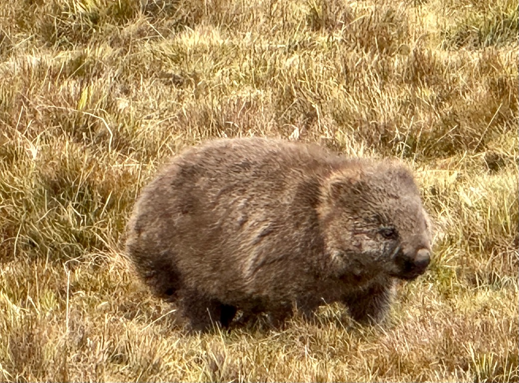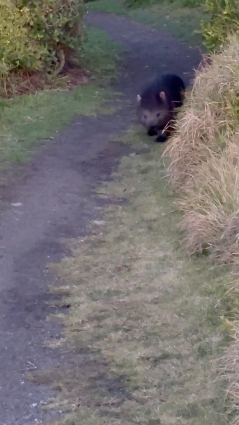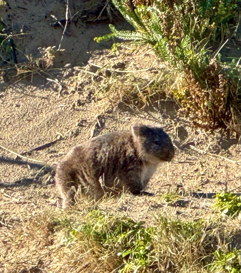 This wombat is less tired, very busy eating grass.The island looks like its been mowed thanks to these guys