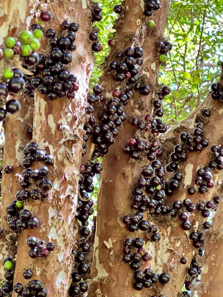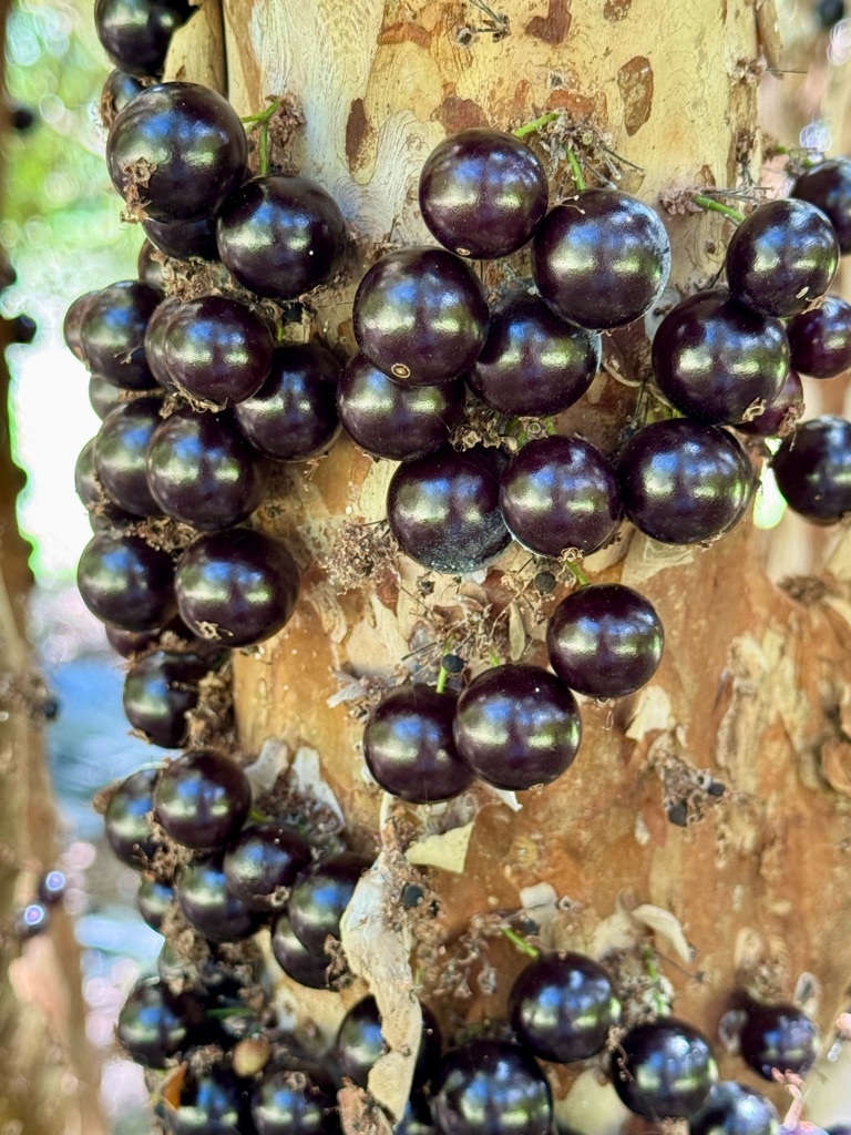 This is a Jaboticaba tree and fruit from Brazil. The fruit grows directly on the branches. It has a sweet pulp and bitter skin.