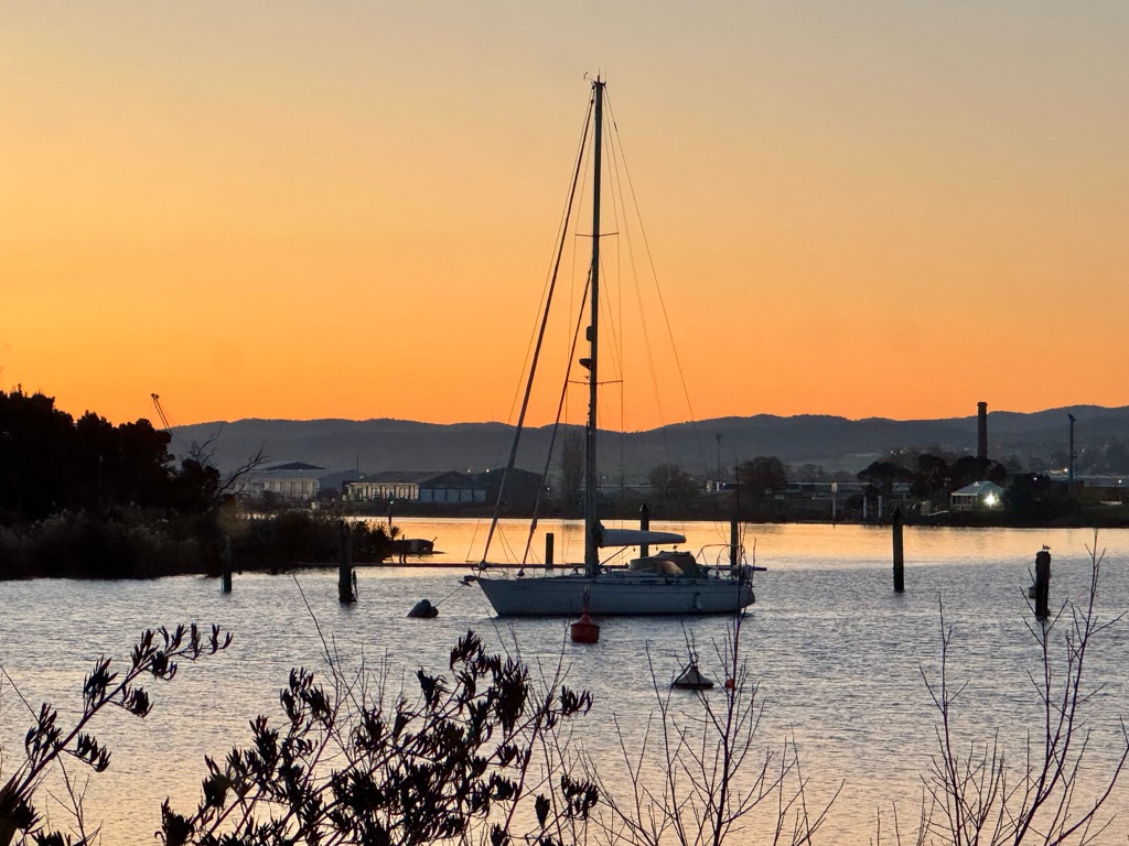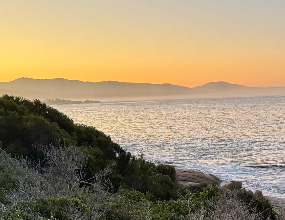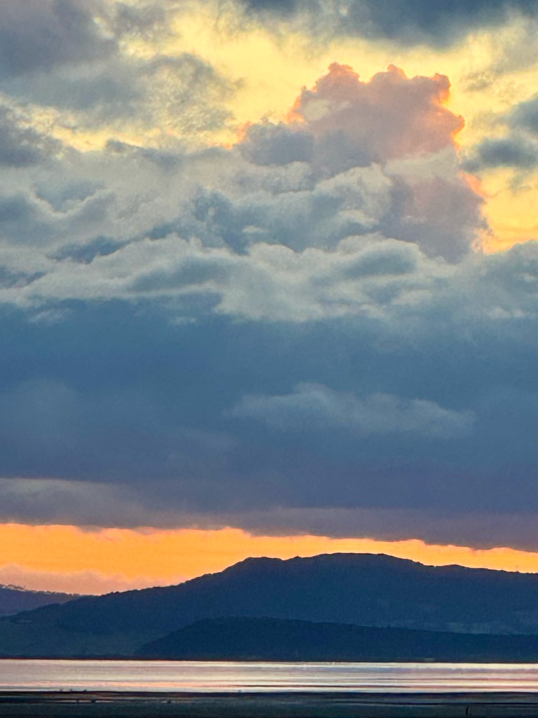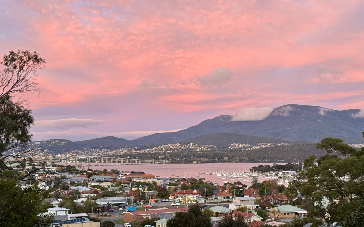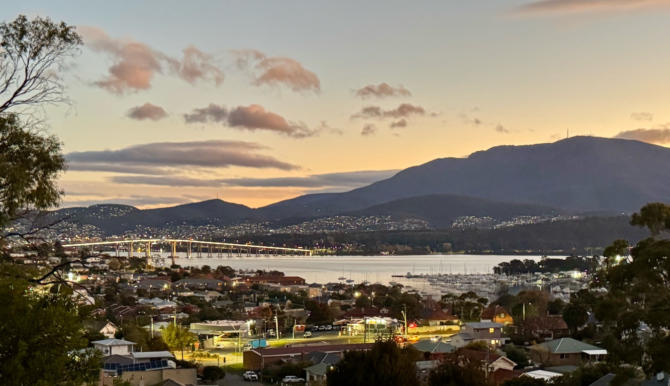 Evening view from our Airbnb looking across to Hobart and Mt. Wellington.
