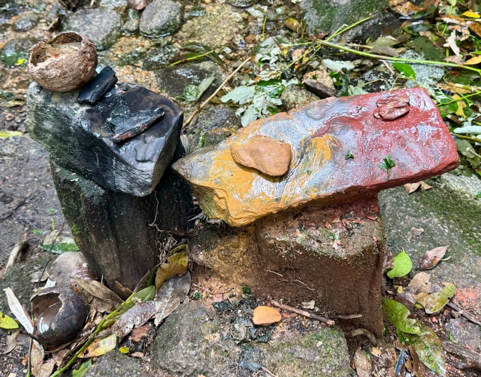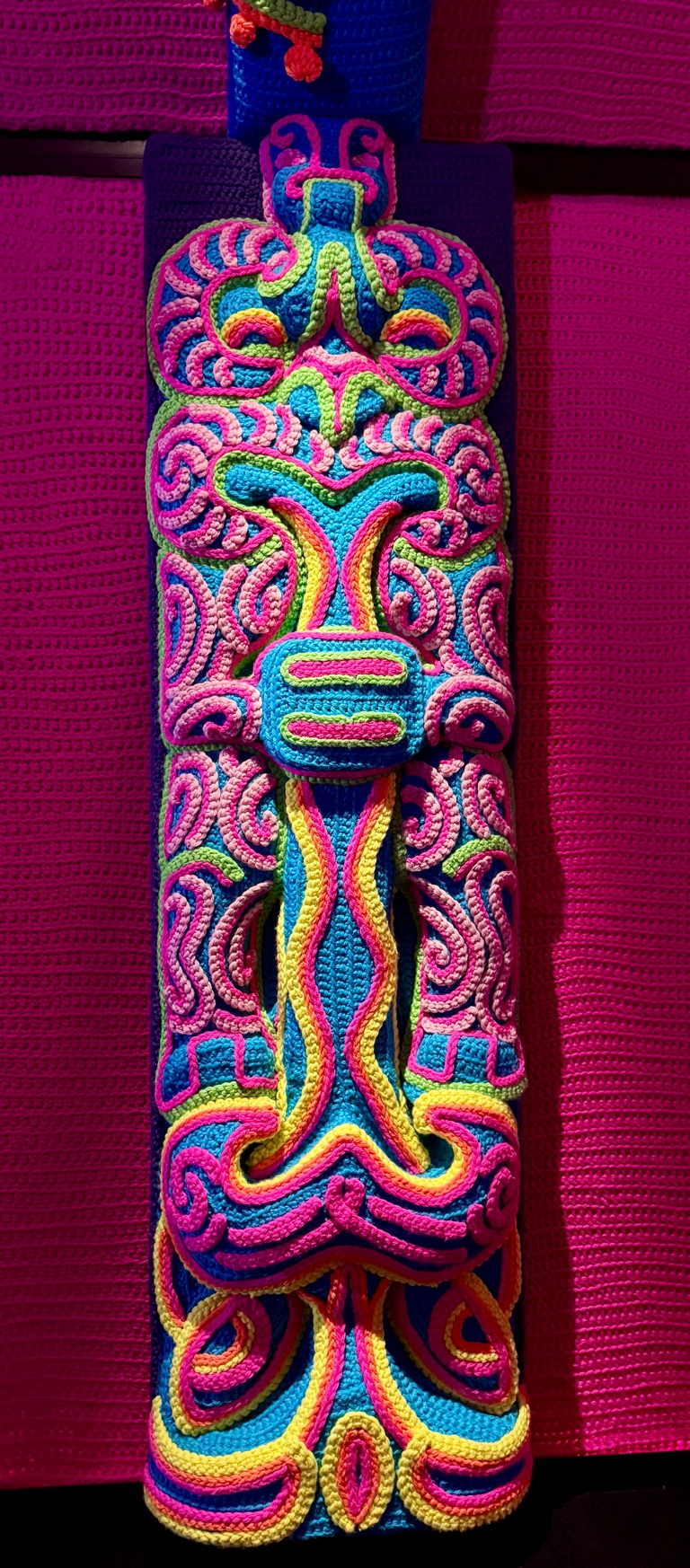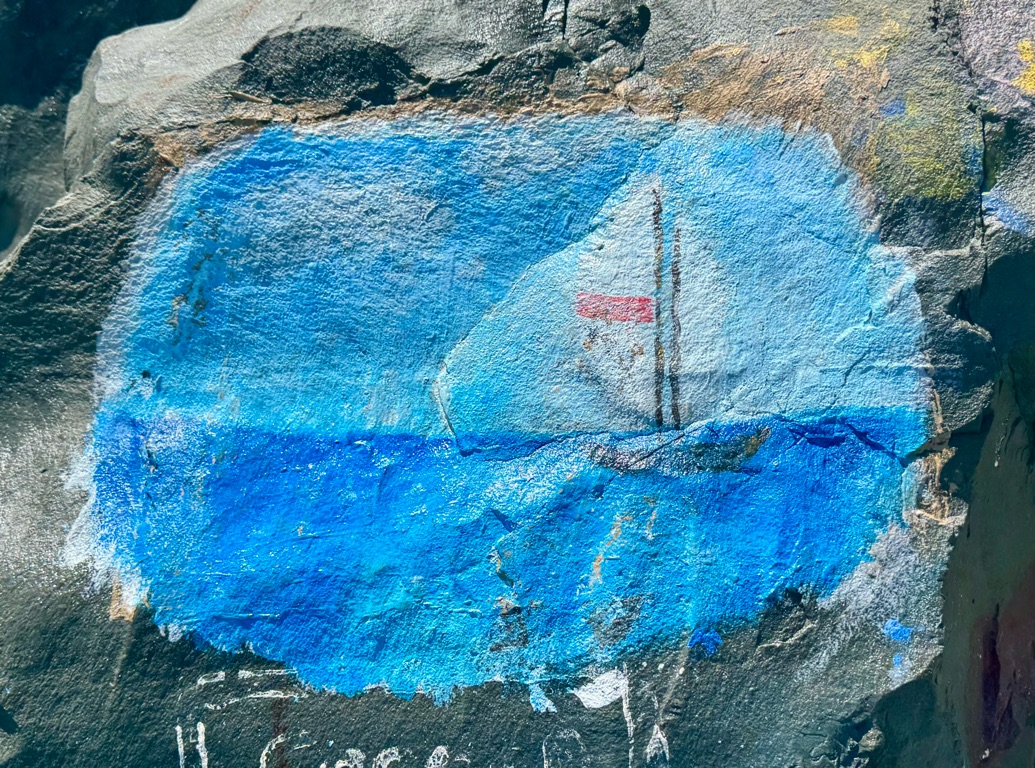 The red pigment is from a rock heavy in iron, the yellow from ochre and the black from charcoal.