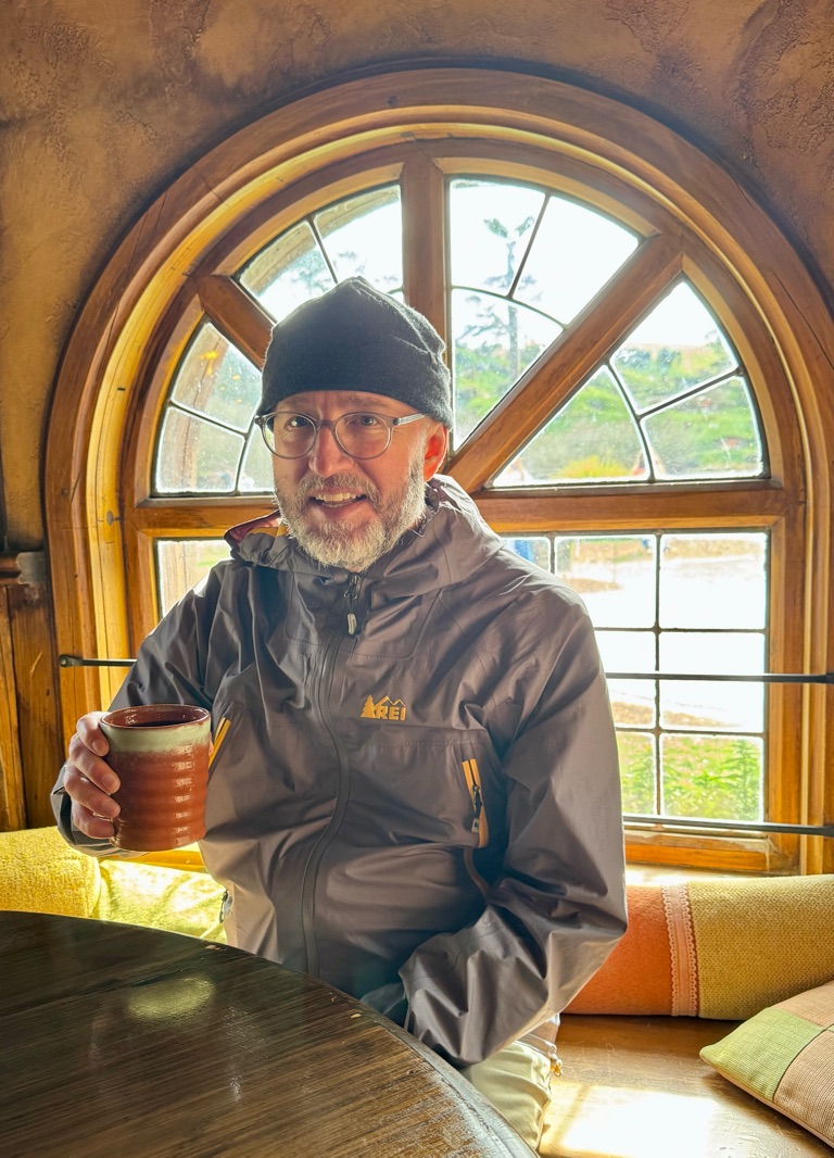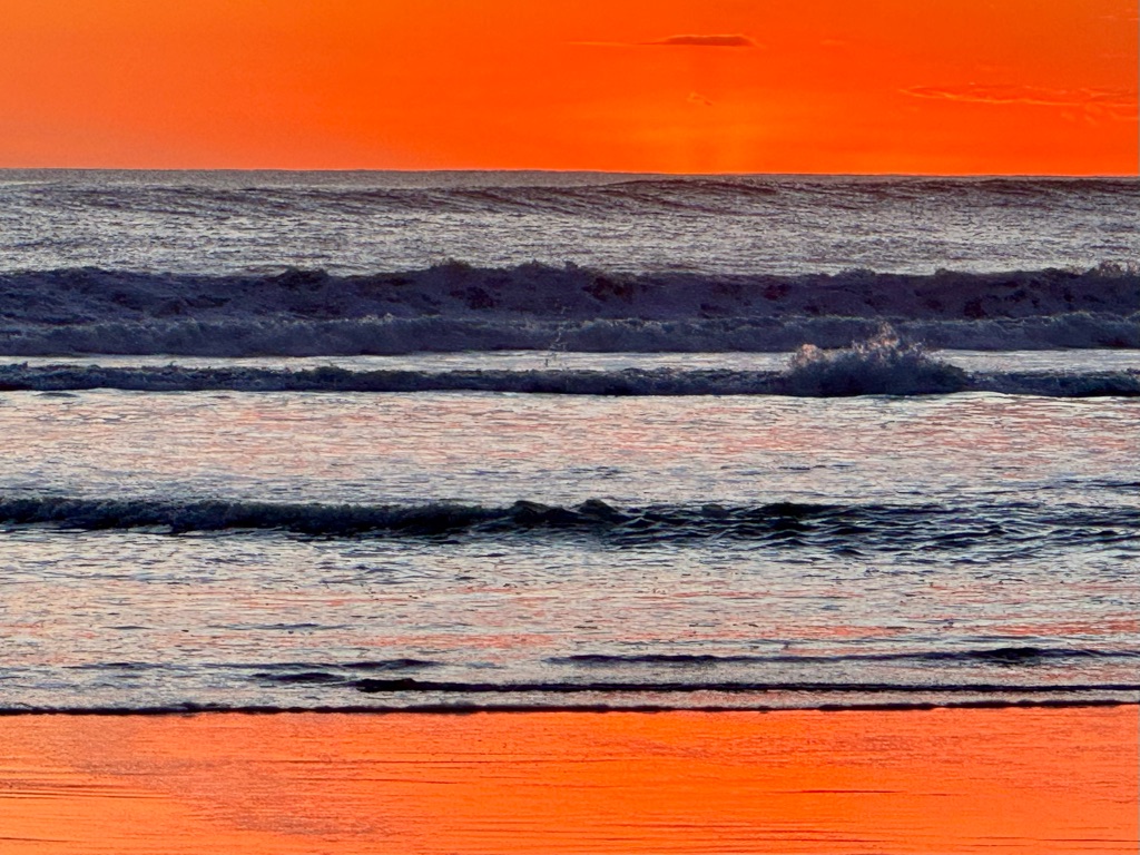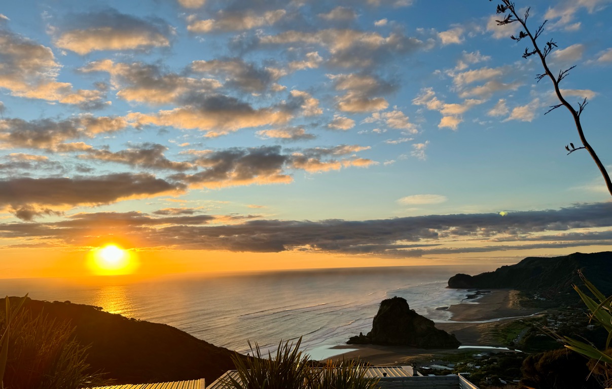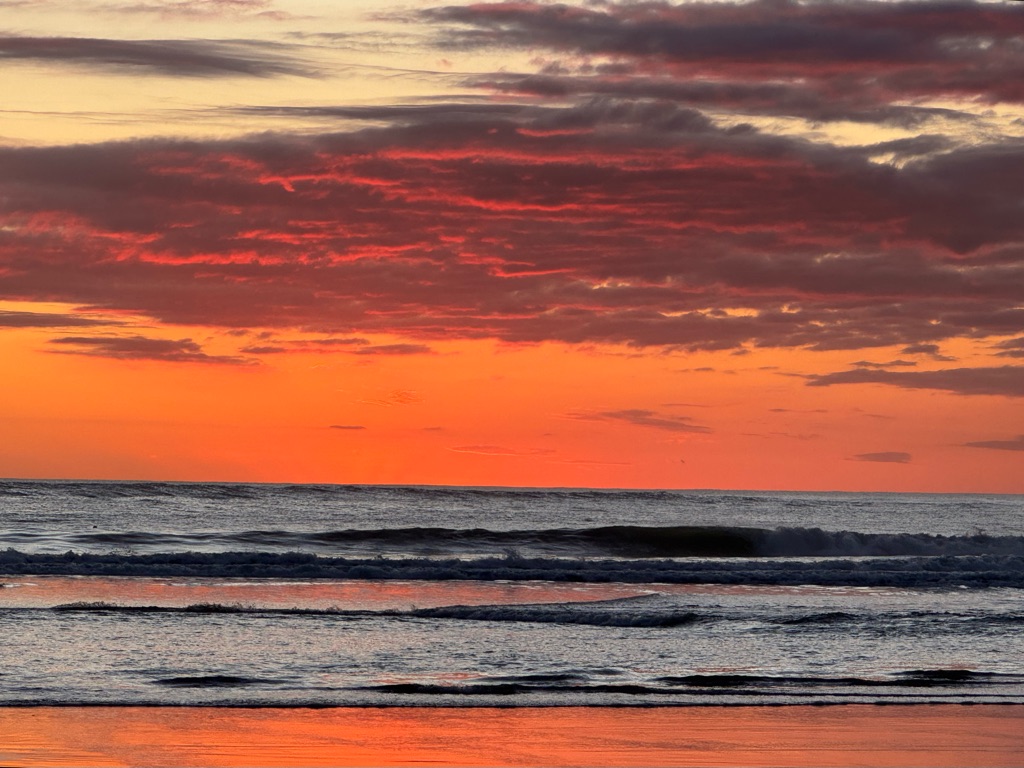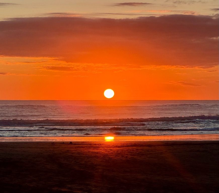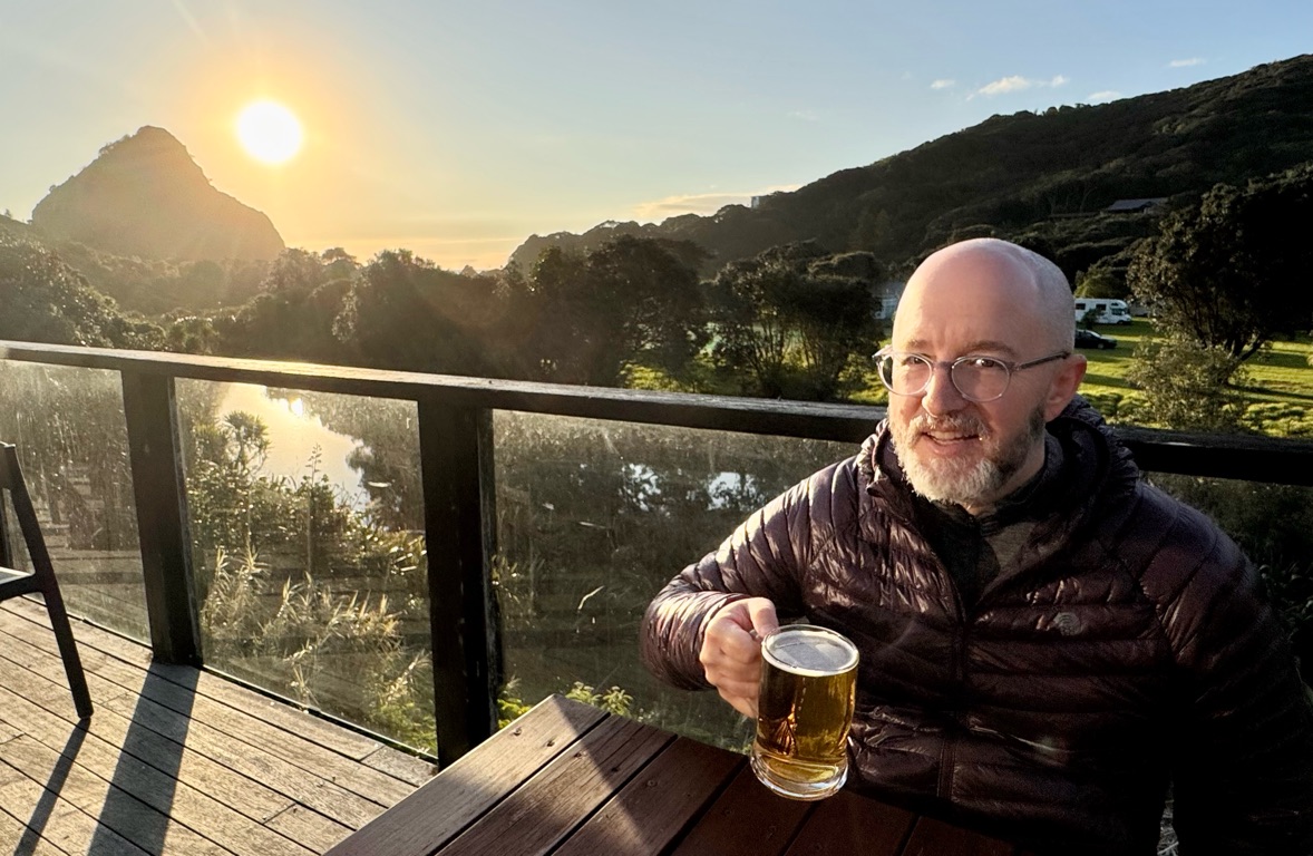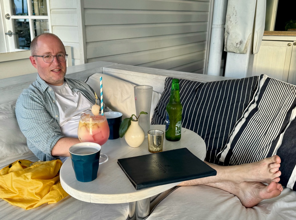 Jessee enjoying a beverage and the sunset at a bar here that has daybed lounges to watch the sunset from.