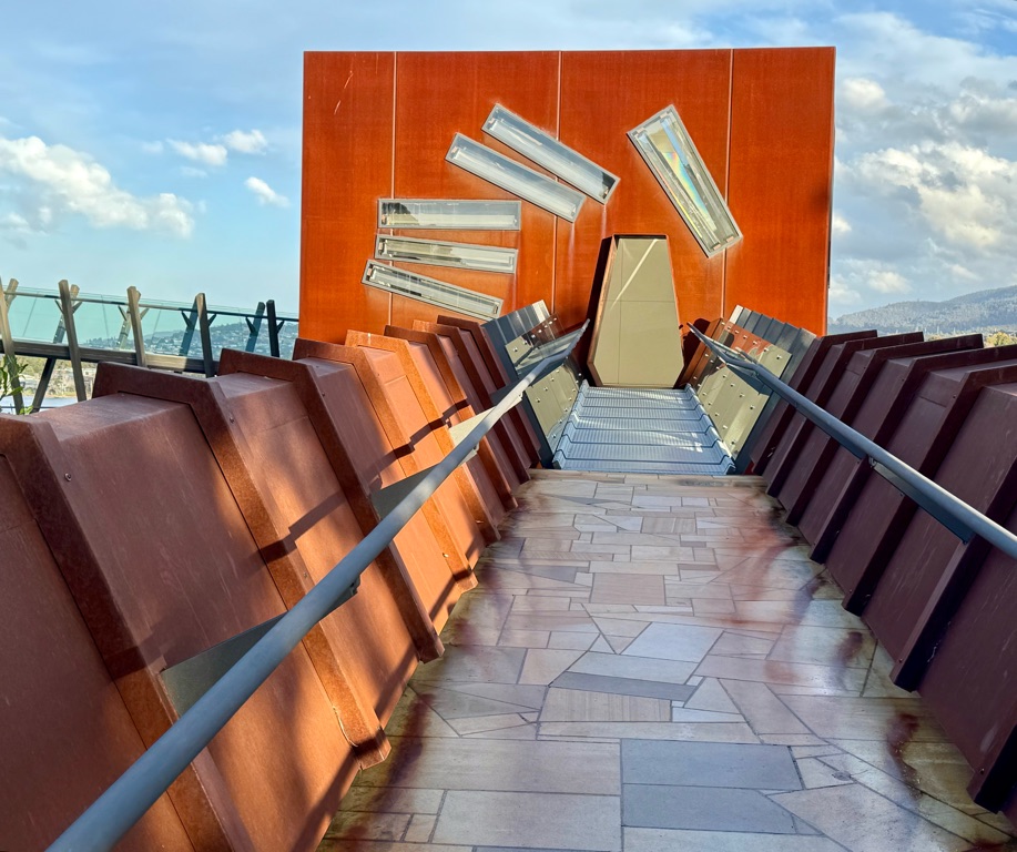 A fun and trippy day at a truly unique place in the world, the Museum of Old and New Art outside Hobart. The passion project of a very wealthy eclectic guy, it defies description. Four stories, mainly subterranean, of thousands of pieces from ancient Egyptian sarcophagus to undefinable modern art. Also several restaurants, outdoor permanece and art space, large scale beer brewing and vineyards producing wine on site, even a recording studio with the original Abby Road sound mixing equipment. Too much to take in.