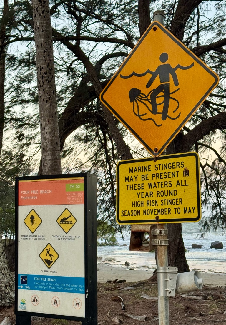 Warning signs at 4 mile beach in Port Douglas. Interesting that the jellyfish is so much more prominent than the CROCODILE!!!!