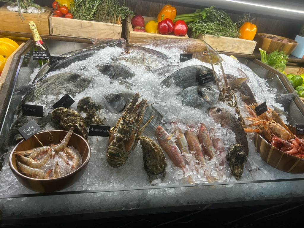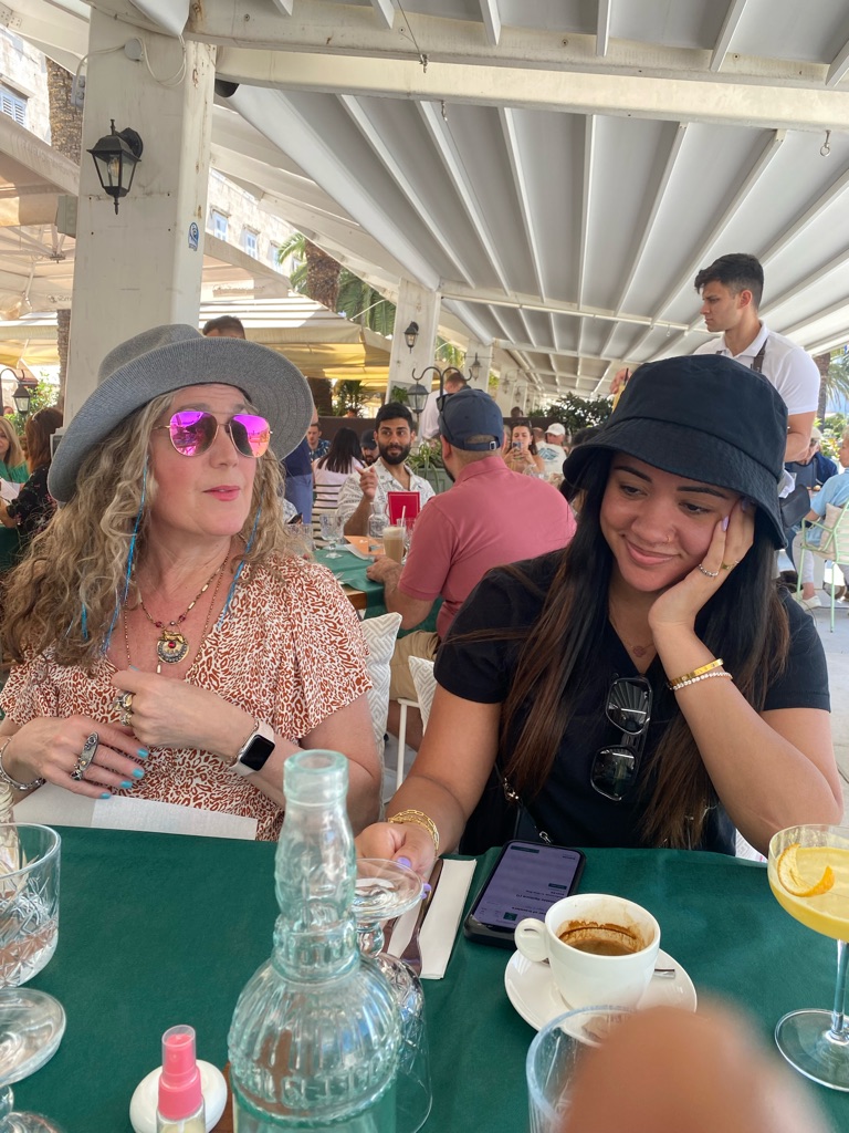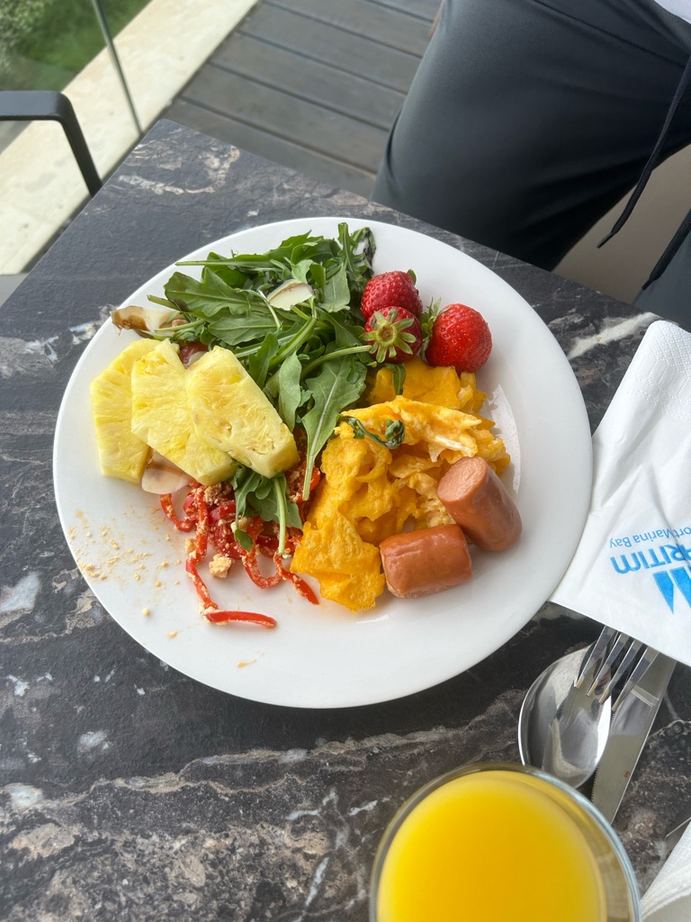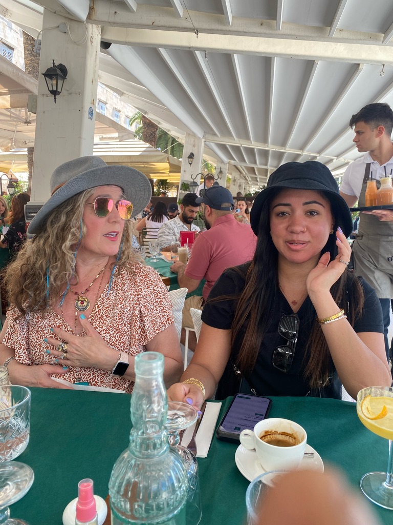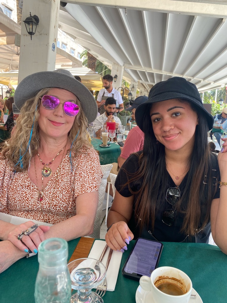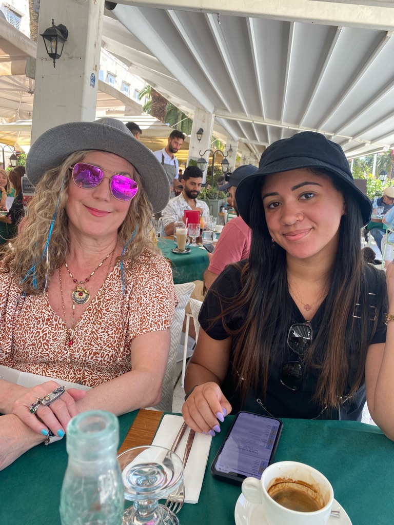 Woke up. Breakfast at restaurant. Michaela went to seaside and laid for a while. Started to get cloudy. Went inside. Cecelia & Mine went into town to pharmacy for butt wipes. All 3 met at seaside then walked inside. Went to hotel restaurant. Waiter gave explanation of the fish. Went upstairs for drinks. Saw large group of black people getting off charter bus (turned out they hate America).