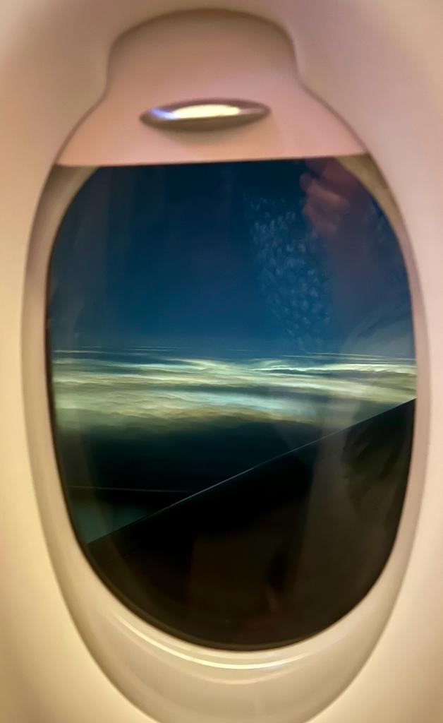 Ei ollut meillä ikkunapaikaa, mutta kun ei naapuria ilmestynyt, niin päästiin vähän levittäytymään ja ikkunan takana möllötti moottori.