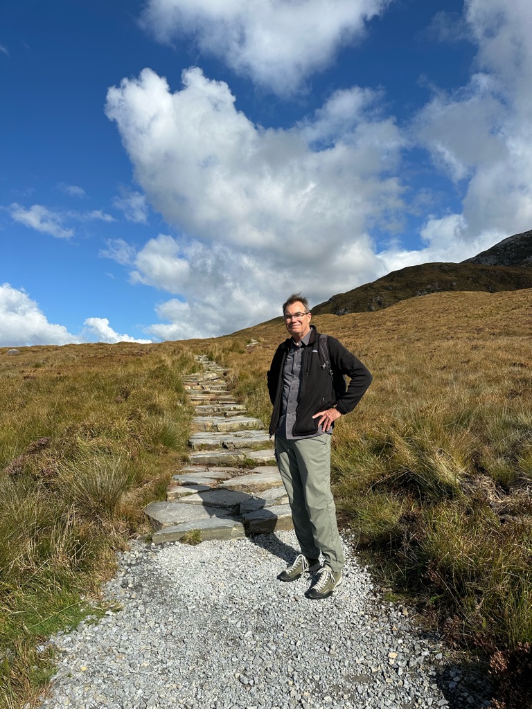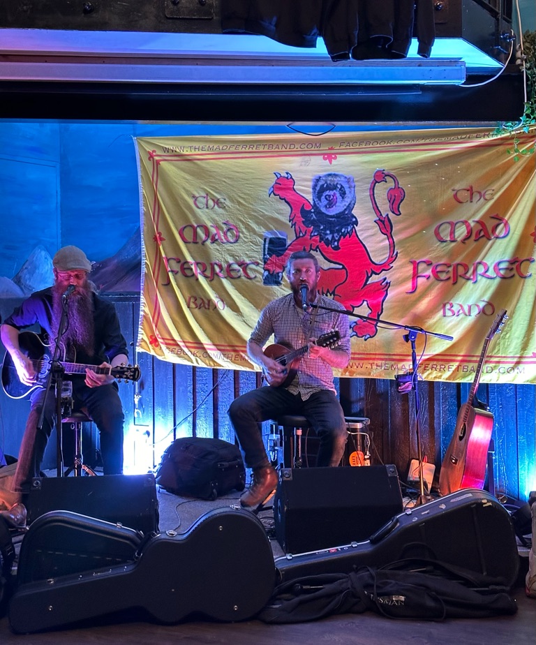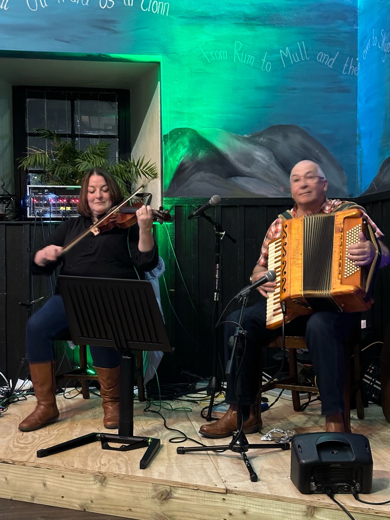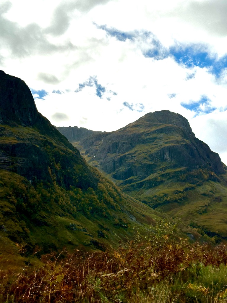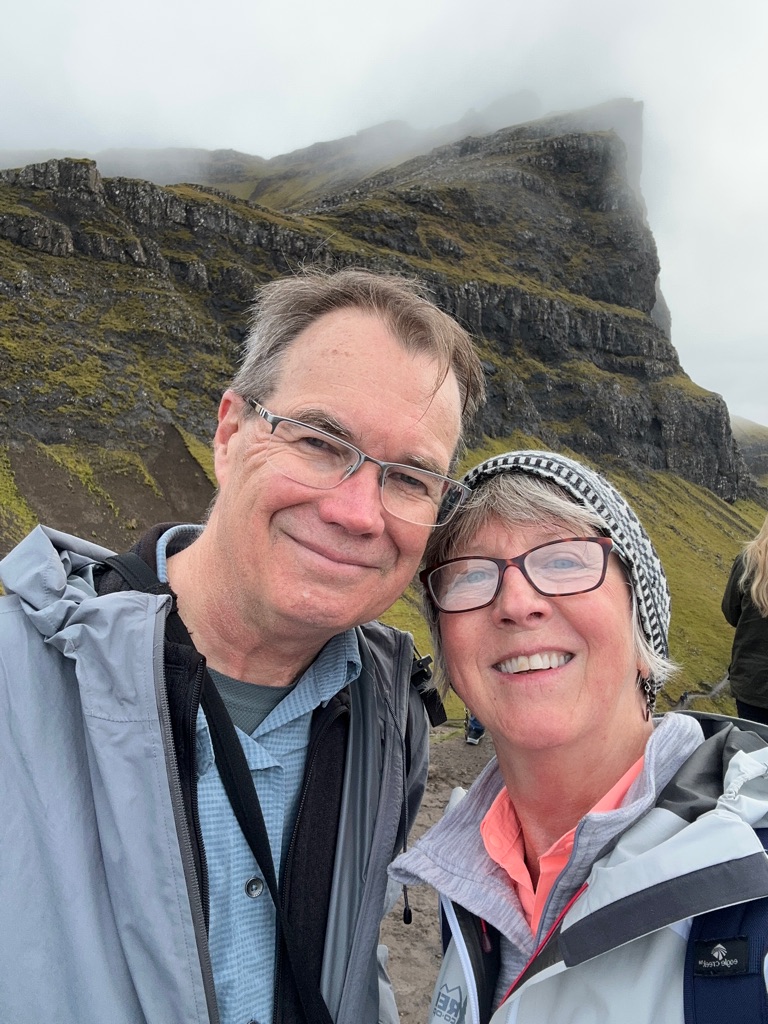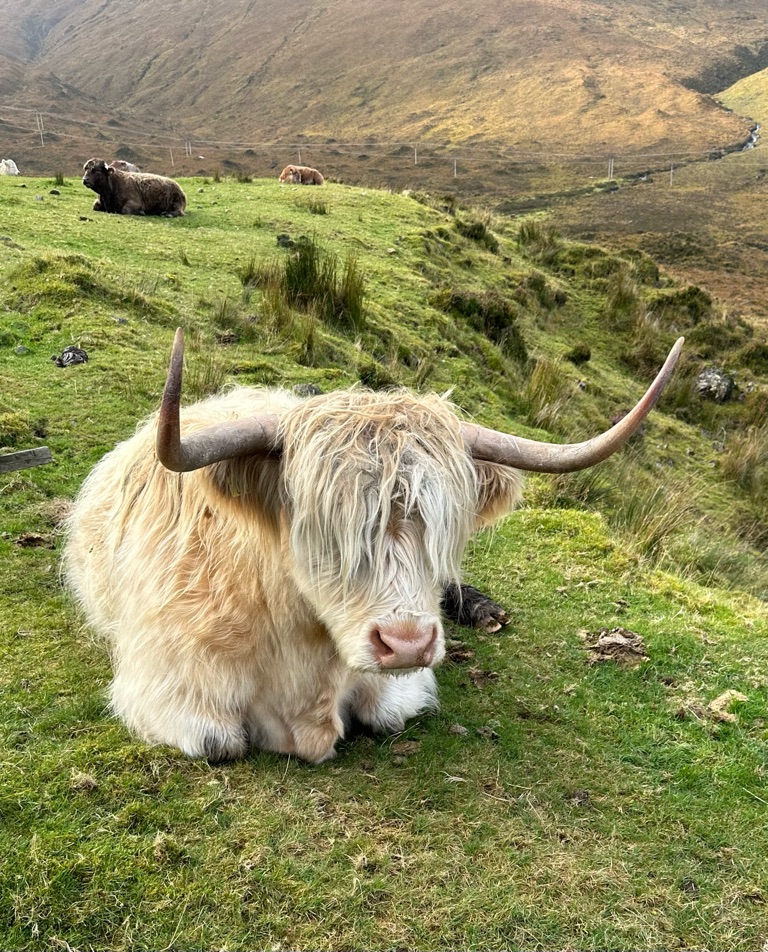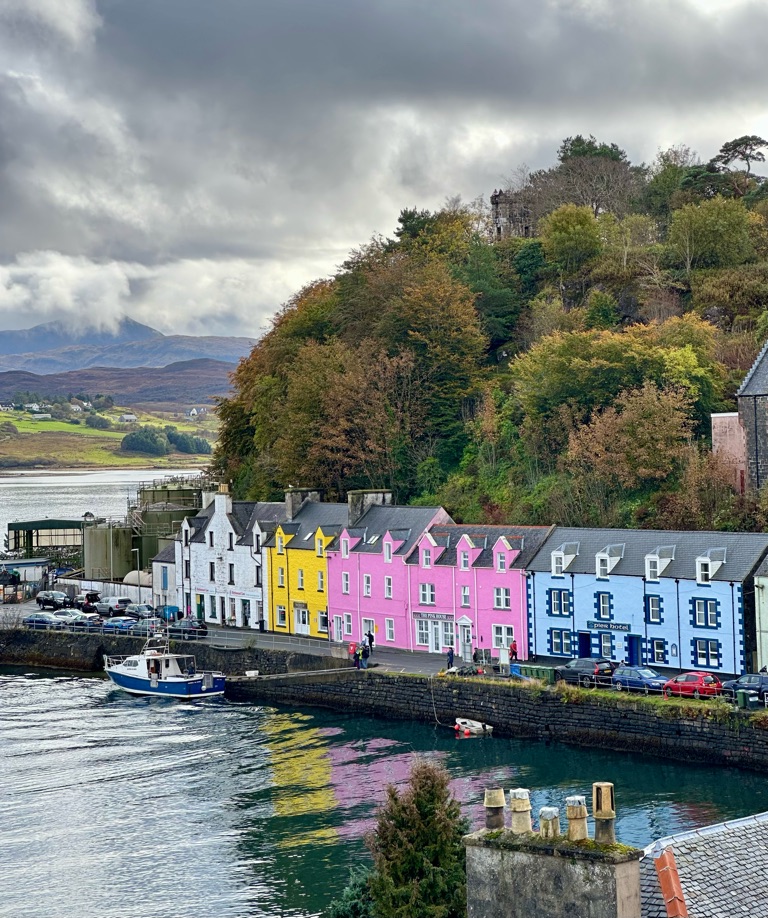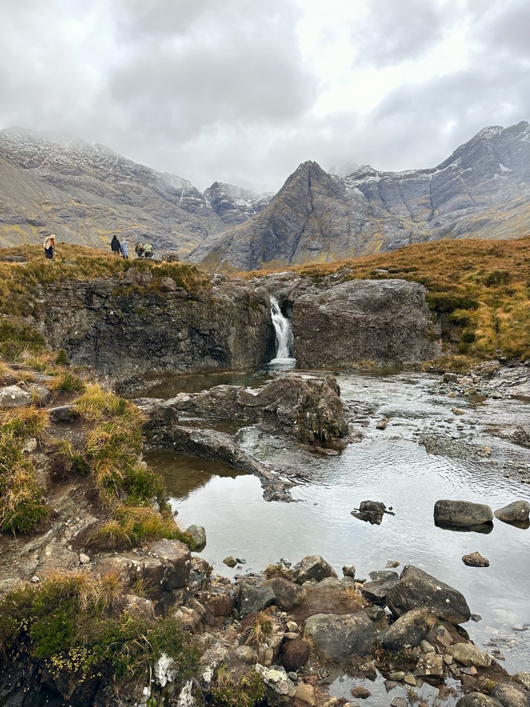 With sunny skies and frost on the windshield we made our way from Fort William to Isle of Skye. We soon learned that the rain would come in waves every couple of hours with periods of brilliant sunshine in between. Caught views of Ben Nevis, UK’s highest peak, as we wound out of town. High mountains were capped with snow. Arriving on Skye we stopped at the Fairy Pools - areas of stone carved out by the water over millennia forming pools and falls. We hiked about in sun and rain and loved it all. Capped the day with live local music and dancing.