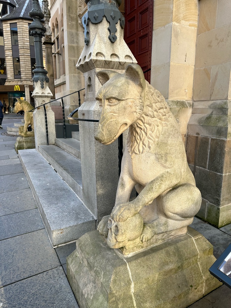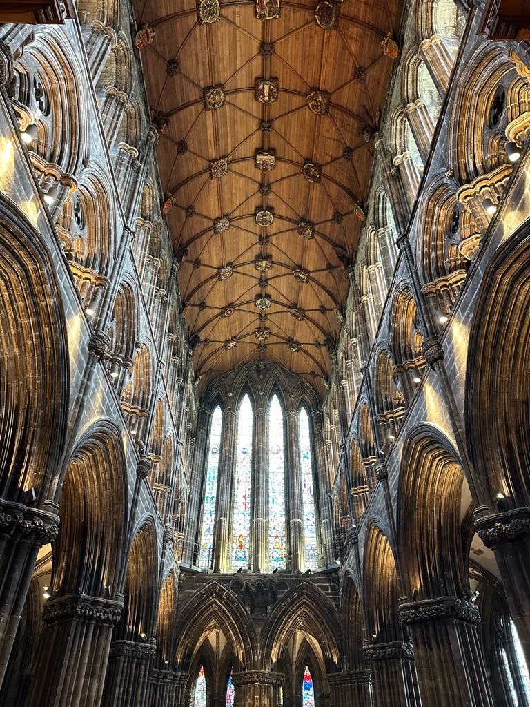 Arrived in Glasgow early and set out to see what this ancient city had to offer. The gloomy weather didn’t help but we made our way through streets lined with red sandstone buildings to the cathedral. Amazingly built atop the original 12th century Catholic church, the cathedral was instrumental in the founding of the city. A cemetery rises above the church and city marking gravestones of the city’s most famous residents. The old city center was bustling with shoppers and tourists, and a bagpiper for some local color.
