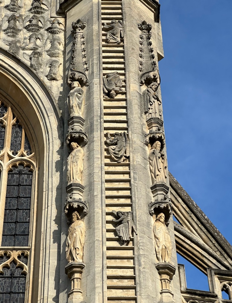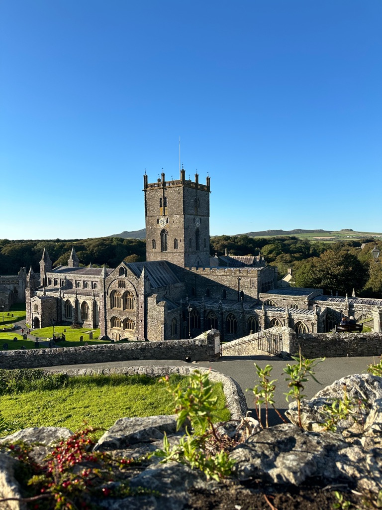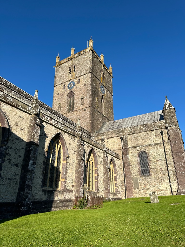 Bath, England to St. David’s, Wales today and such a contrast. We paused for lunch in Mumbles on Wales’ South coast. A lovely little place that is clearly a summer favorite. St. David’s is UK’s smallest town, and also a favorite retreat. The medieval cathedral is spectacular and unique. It is set below the town alongside a now crumbling ruined palace. The nave slopes considerably along its length but having done so for centuries is of little concern. The local pub (there appears to be just one) is a hangout and local source of information. Dogs are allowed everywhere with owners and sit politely in restaurants and bars.