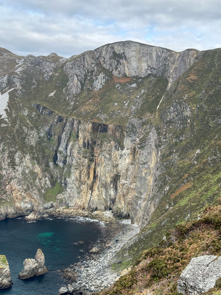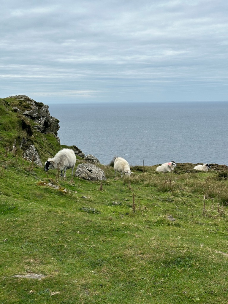 A winding coast road led us to Slieve League. These steep cliffs are a sheer 1,972 feet above the sea at their highest point. The wind whips along the shore and the cool temperatures make the hat and scarf vendor a popular chap. Sheep graze the cliff sides unbothered by the heights, the weather, and the passing visitors.