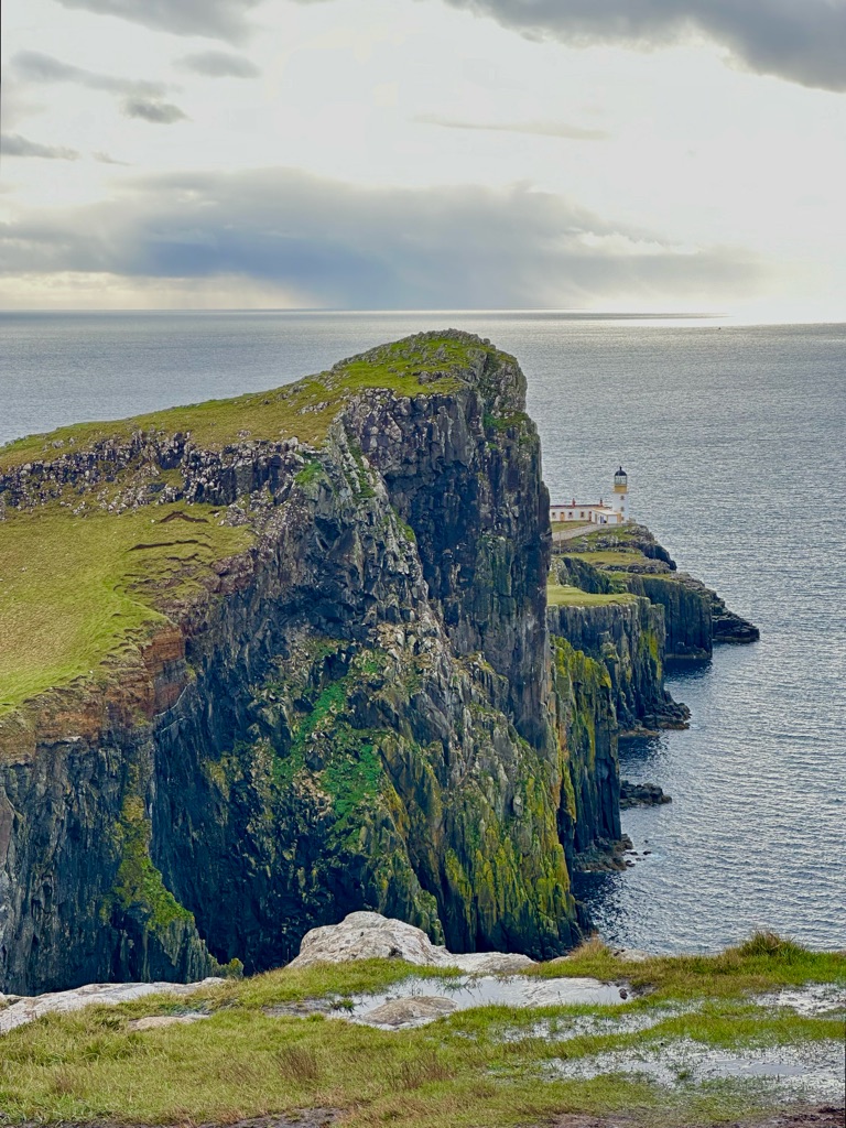 The sky started to clear as we made our way up the Old Man Of Storr hike- a 3 mile round trip trek with about 1,150 feet of elevation gain. Fantastic views and great way to work off a huge Scottish breakfast. A loop back through Portree and we wound our way out to the Neist Point lighthouse. After the morning’s hike, the hundreds of steps down looked like a bad idea so we slogged through marshy terrain for a better view. Before we could retreat to the car it started to sleet. The weather changes here are incredible.