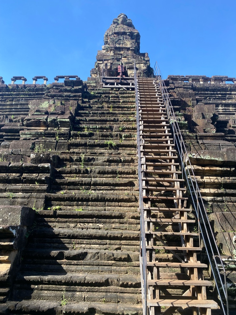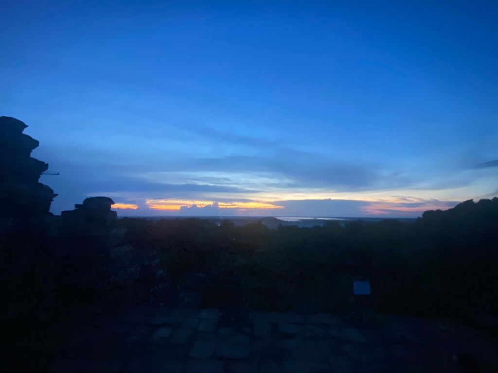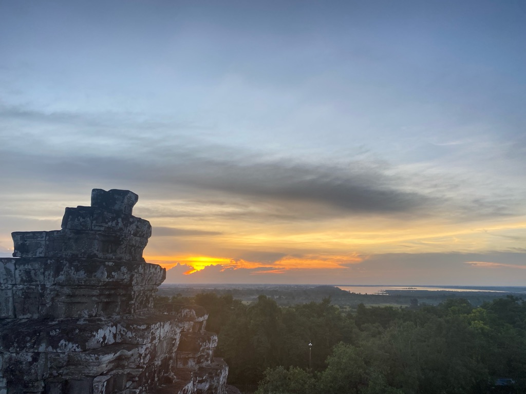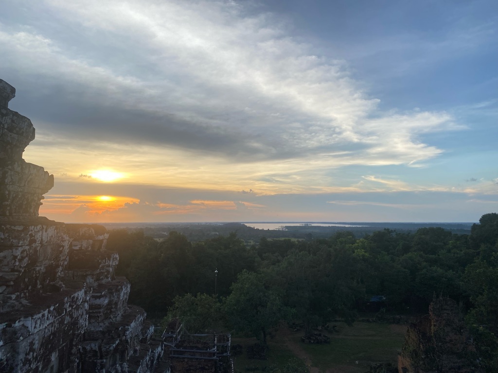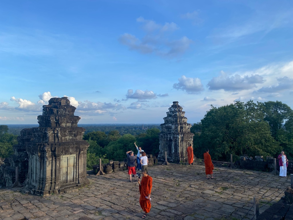 Le temple de Phnom Bakheng pour le coucher de soleil. Tout en haut d’une colline. On y voit Angkor Wat de haut mais de l’autre côté du sunset.