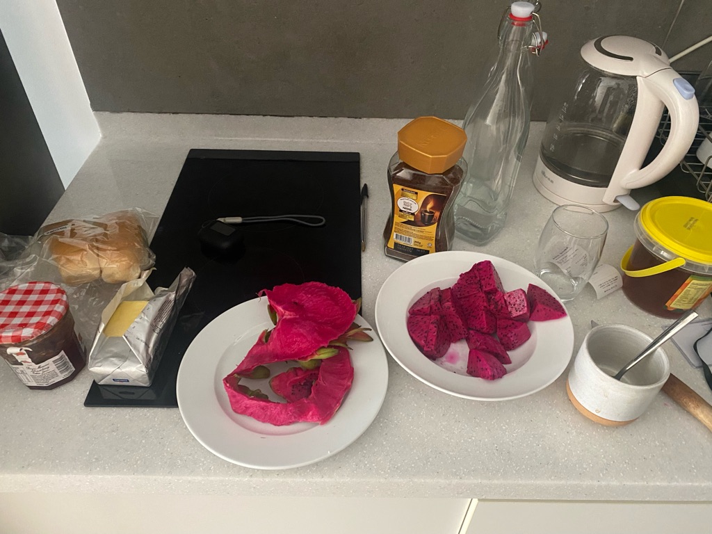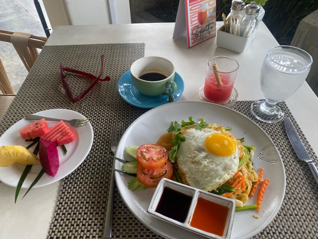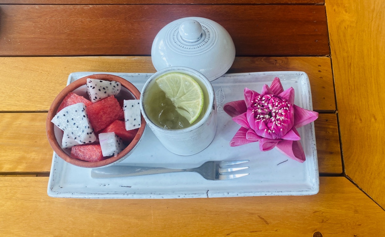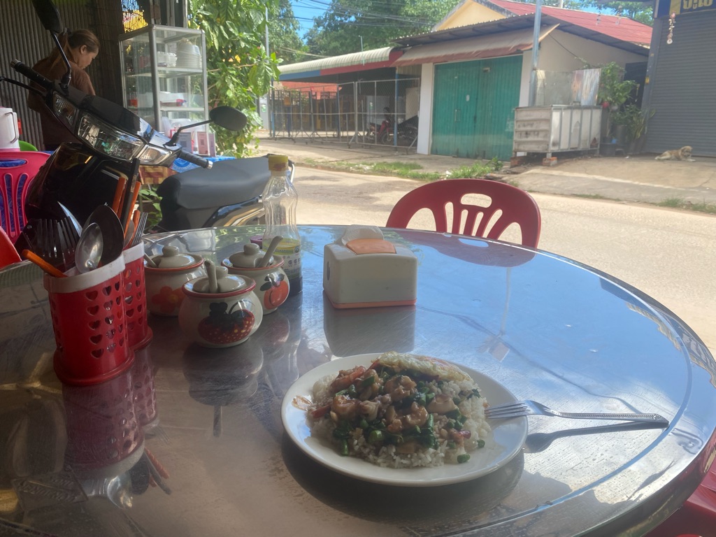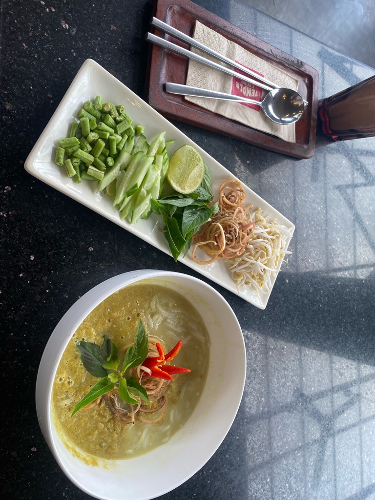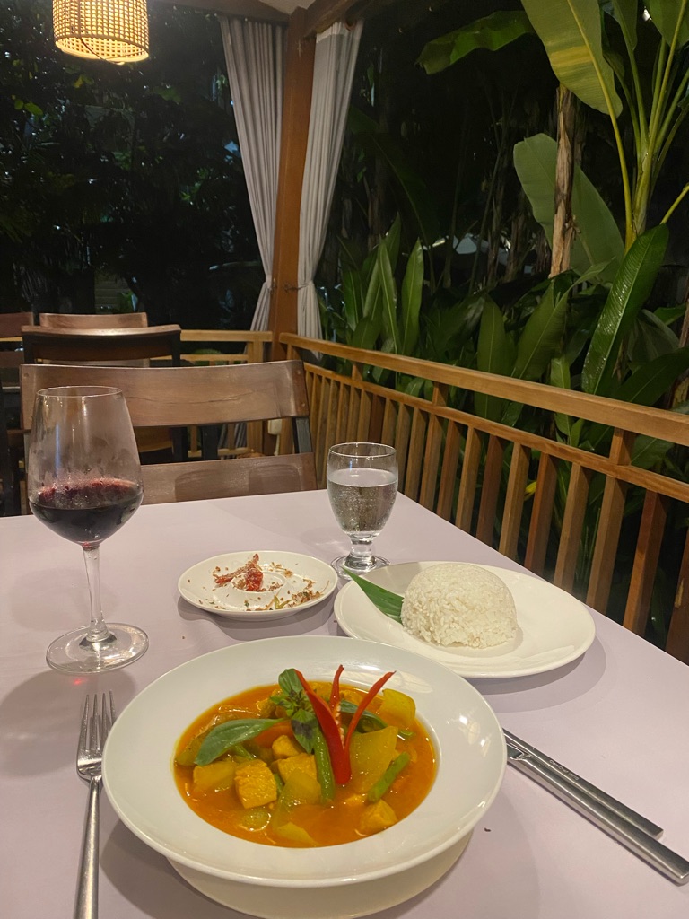 Curry rouge khmer, verre de vin pas top et bananes flambées en dessert. Ils ne les ont pas flambées devant moi !! Mais c’était bon !