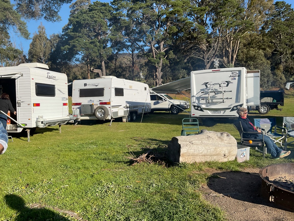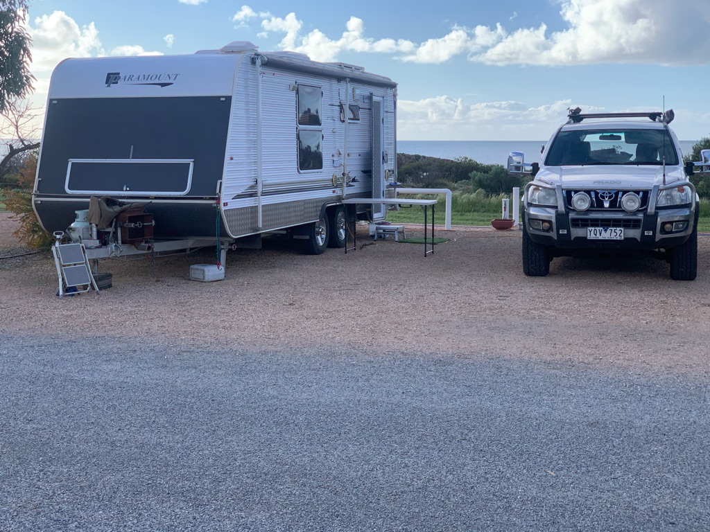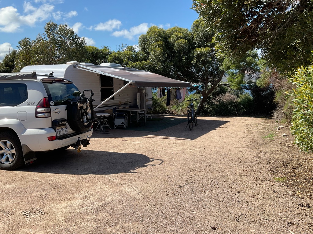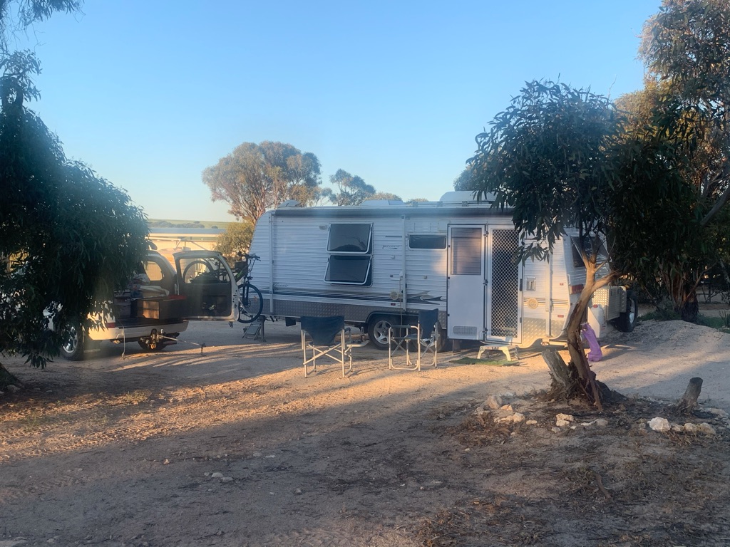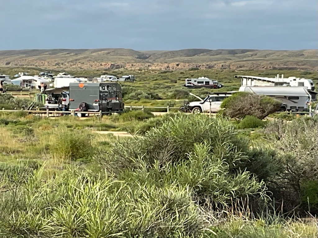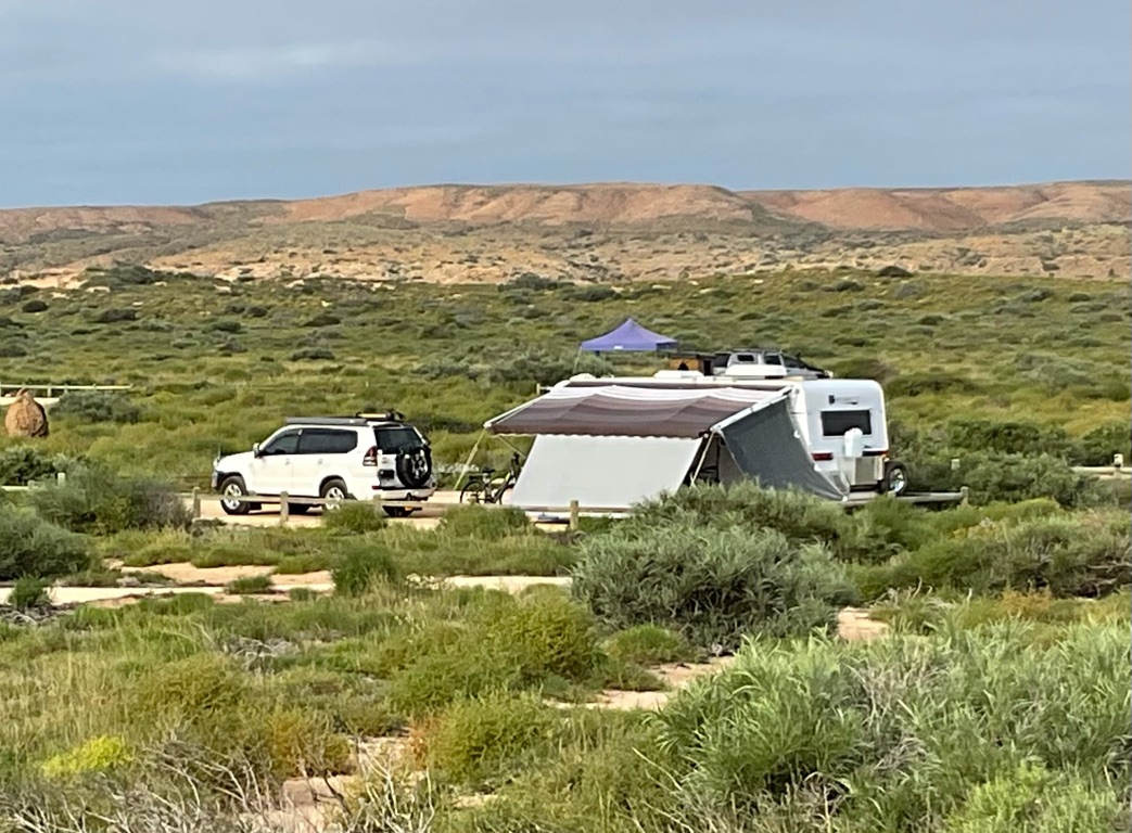 Camp site at Overland Corner. The pub is behind the van over the hill.