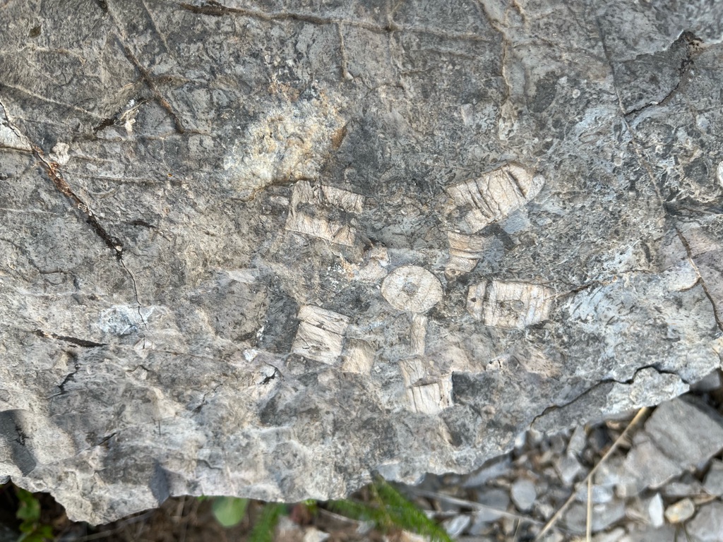 After dinner I decided to walk on the Trail a bit in the quiet early evening. \240The trail brought me through meadows and pockets of spruce trees. \240I could feel the altitude if 11,000 feet. \240I stopped to examine a limestone outcrop that was chock full of crinoid sea-lilies and snails! \240Awesome! \240