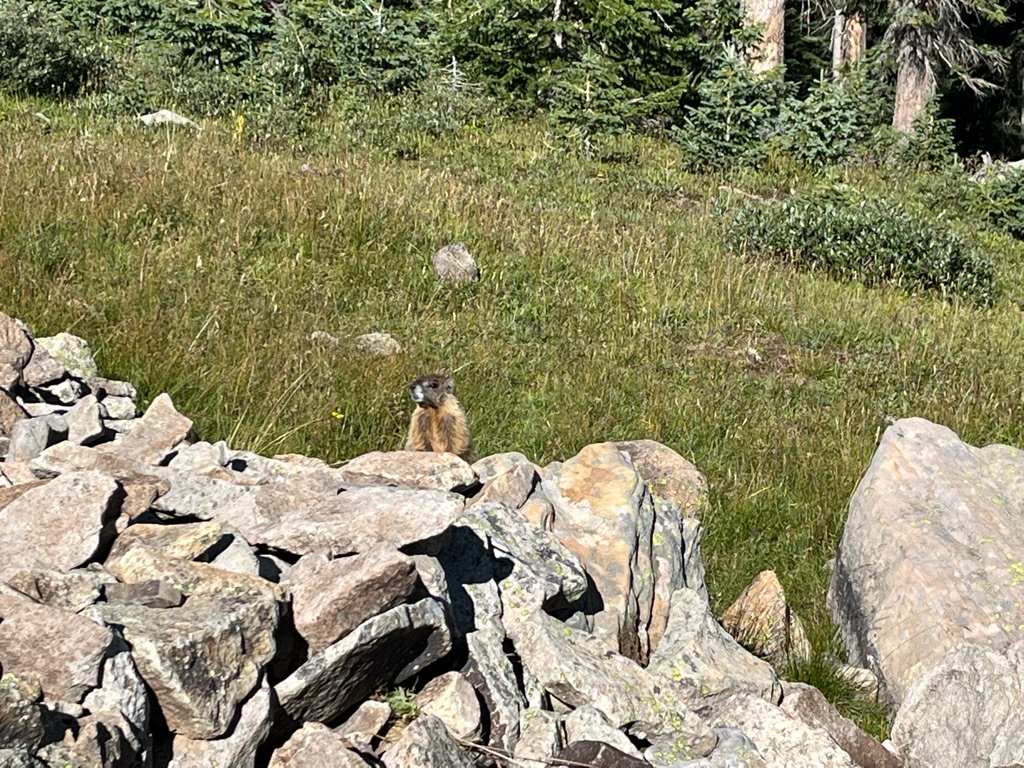 In the still, fading light I saw some kind of grouse quietly stalking by. \240I’m guessing it was a Dusky Grouse. \240A few moments later there was some kind of mammal that looked a bit like an ermine with a coppery yellow coat, big ears, and a black tipped tail making its way across the rocks. \240It was a long tailed weasel! \240Trail magic indeed.