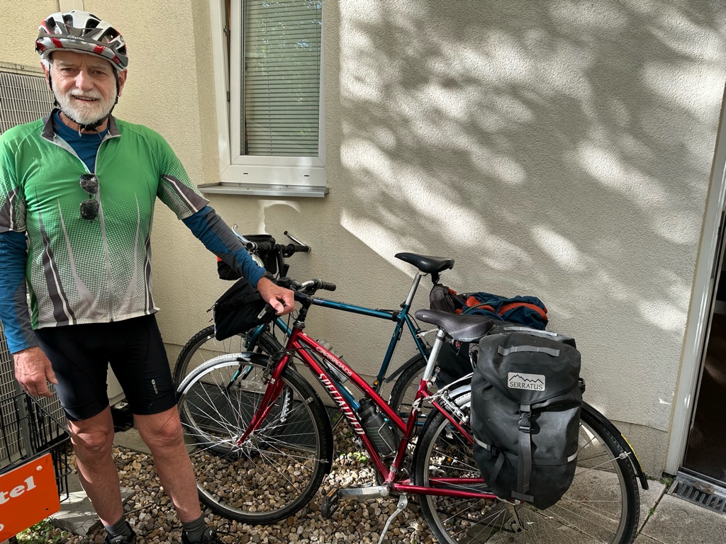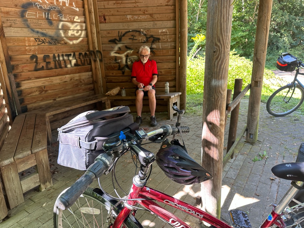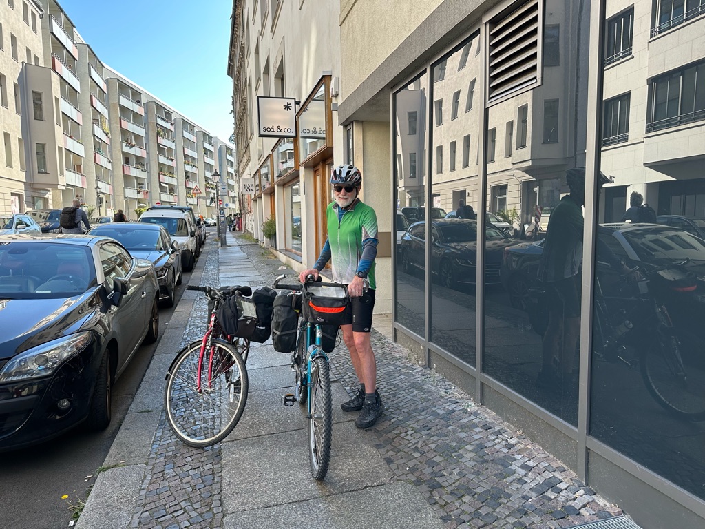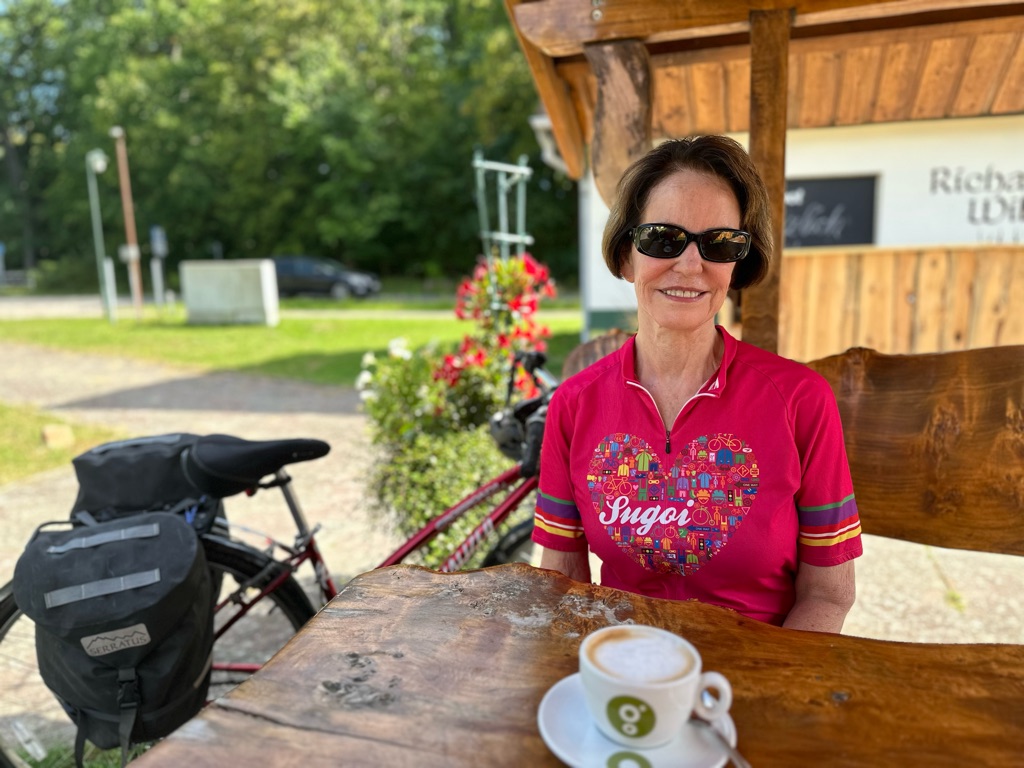Stopped for a cappuccino. Lots of cyclists on this route. Some touring cyclists, in both directions, and many people out for day rides. Rich counted 22 bicycles here and our two were the only ones that weren’t ebikes.