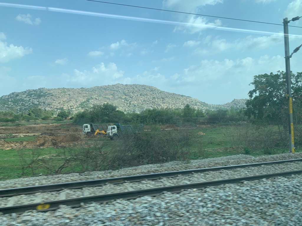 The train from mysuru to chennai is roughly 7 hours long. It stops at Bengaluru before cutting through the Karnataka landscape at 130kmph. The views are incredible disassembled mountains, their boulders neatly stacked. Rice fields that stretch for miles before descending into thick jungle.