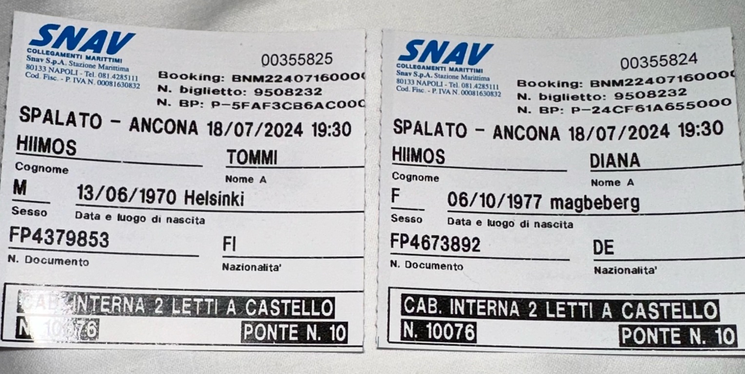 Vihdoin laivassa! Ihana että pääsimme hyttiin ja suihkuun jo tunti ennen laivan lähtöä. Italialainen palvelu on virkistävää Kroatiaan jälkeen. Kroatia taitaa olla aika nuori turismimaa. Asiakas on vähän epäilyttävä ja sitä täytyy opettaa.. :)