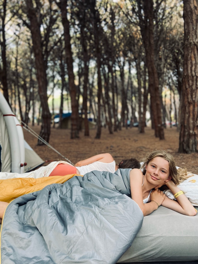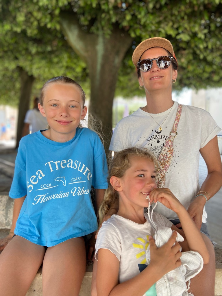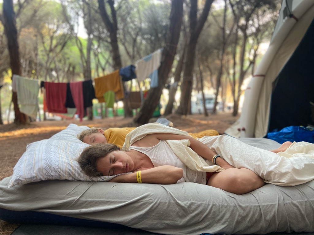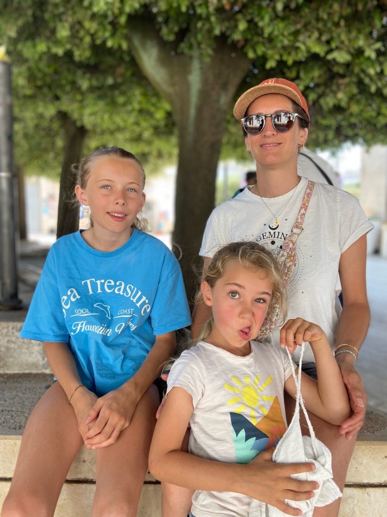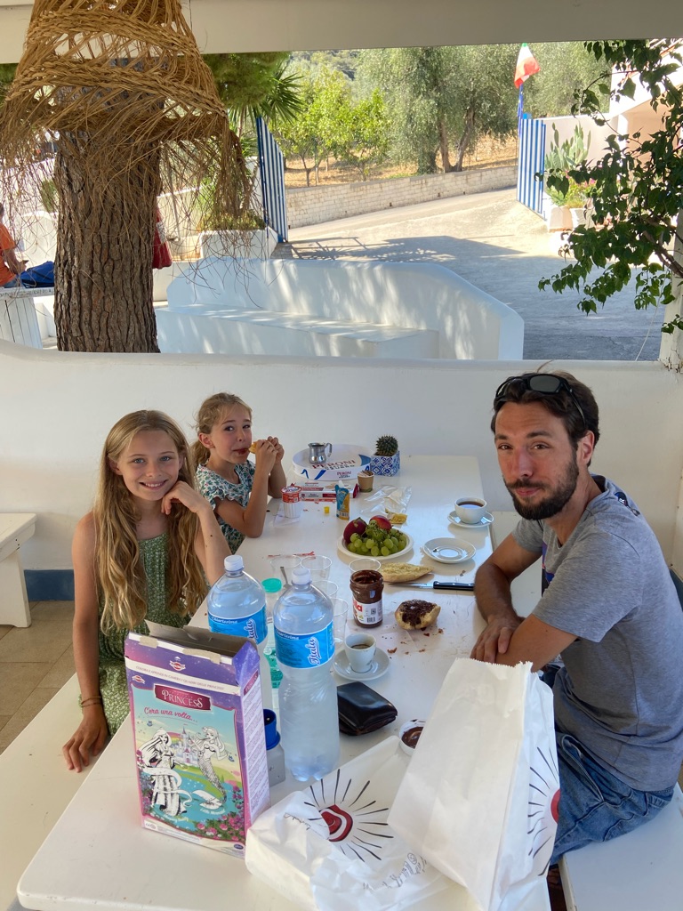 Rose et Amandine ont dormi à la belle étoile sous les pains. Réveil en douceur avec la lumière du jour. Il est sept heures. On s’était promis d’aller nager jusqu’à la bouée avec Rose. Elle se réveille avec le sourire de bonne humeur. Prête à en découdre avec la mer.