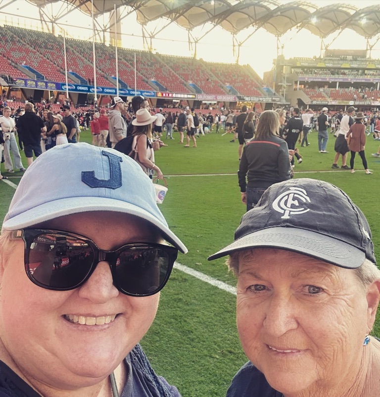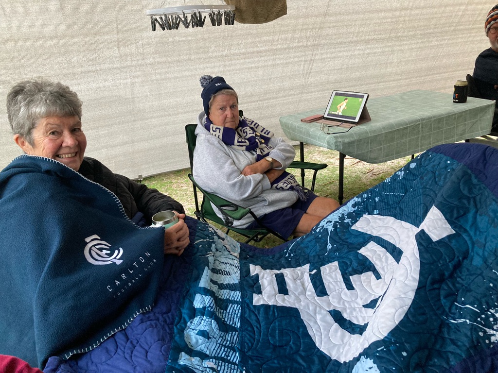 Two very happy Carlton supporters. It was a close game at the end but Carlton won by a few points
