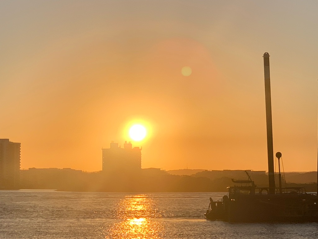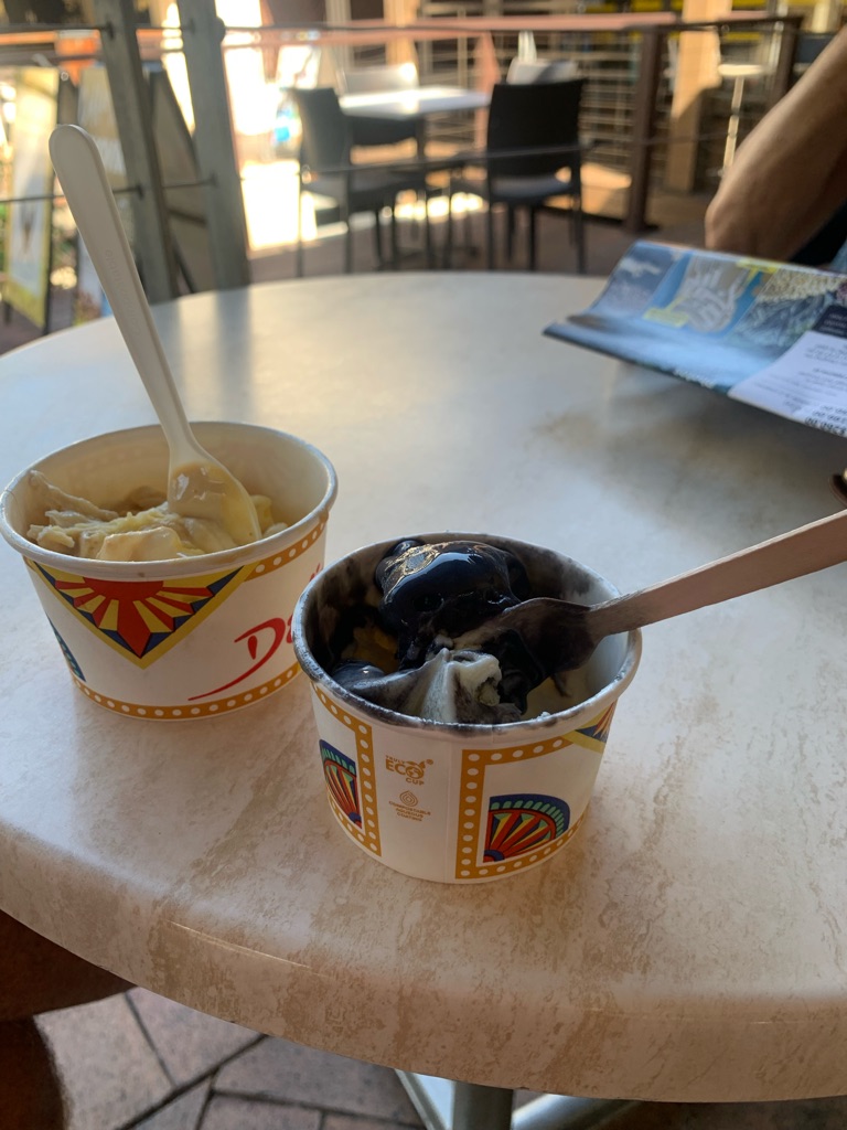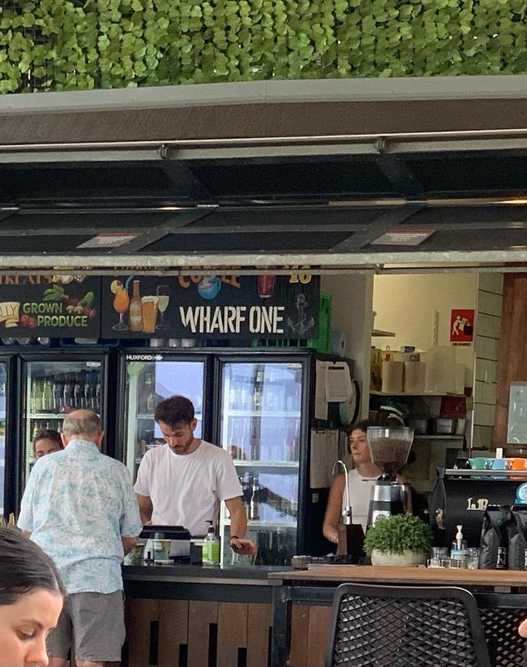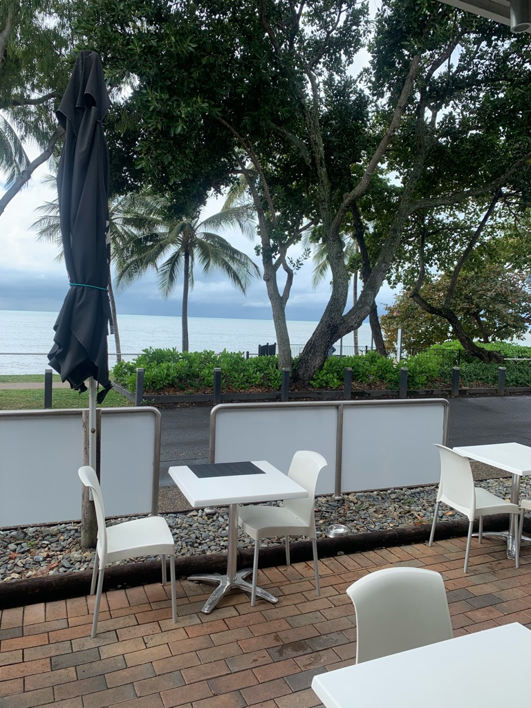 Sitting at a table so we could look at the sea, unfortunately by the time we got there it was dark, so there was nothing to see.
