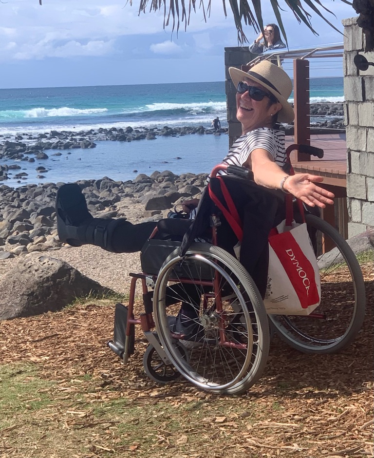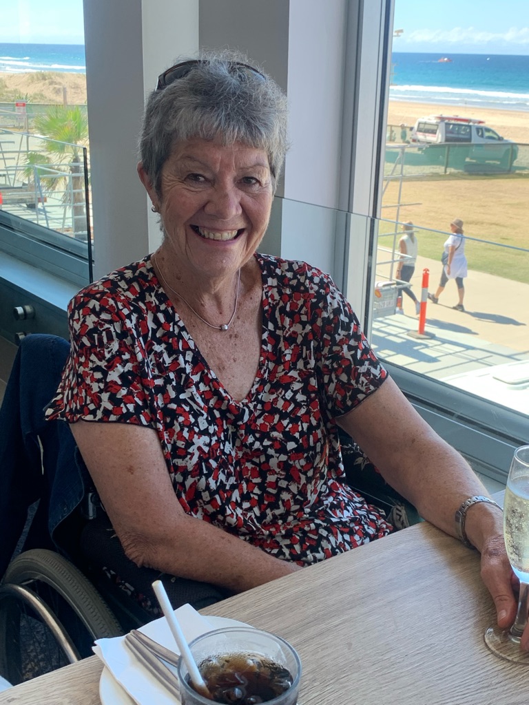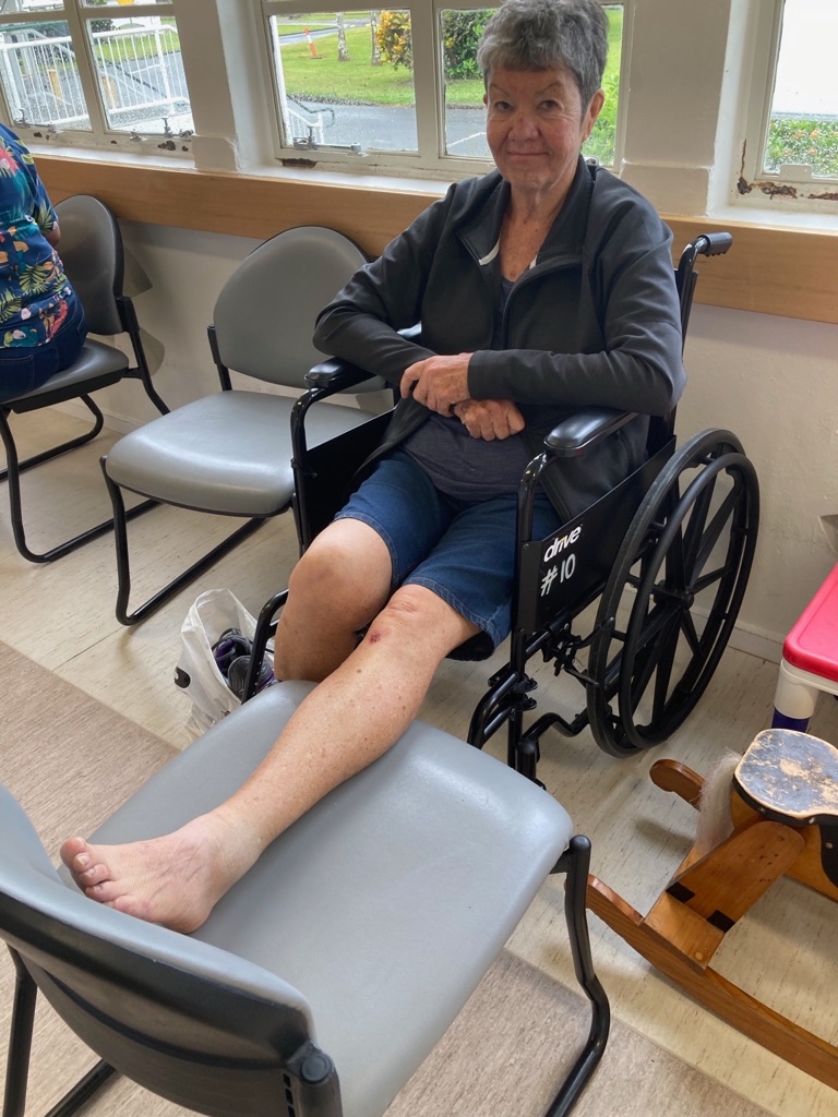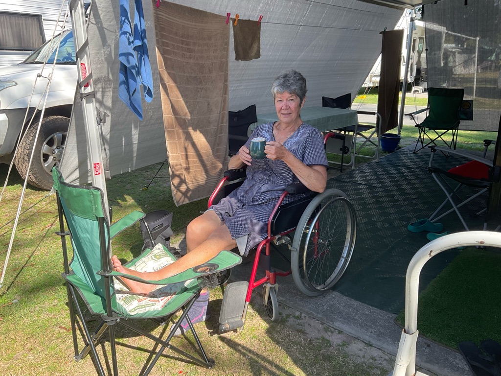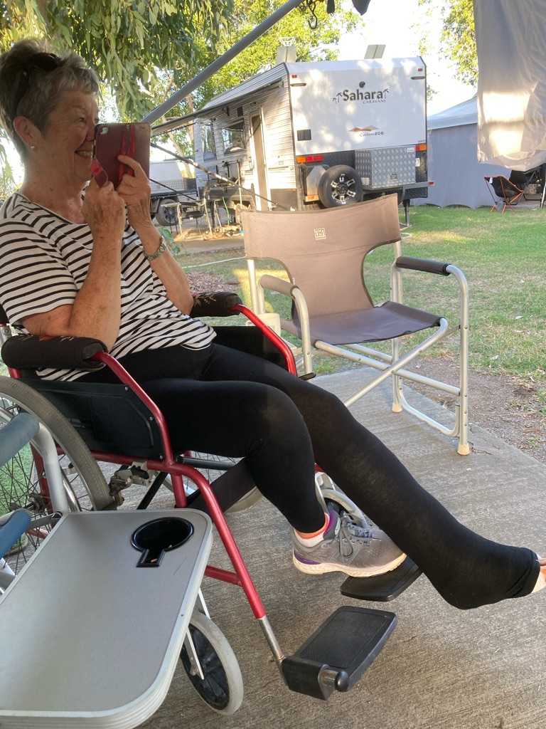 Marg all tucked up in her wheelchair site. It actually was a pretty good seat except for the yobbos behind her. Tom sat there with her also