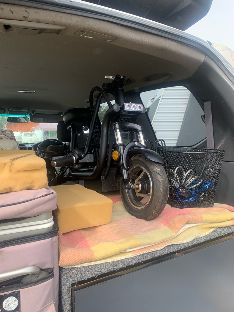 During lunch we discussed how we are going to transport my scooter. We decided that putting it in the back of the Prado is too difficult and one or both of us is going to hurt something. So Brian came up with the idea of putting it in the van. So back to the favourite shop again ( they’ve got some funds out of us ) and he bought some ratchet straps and little saddles to put on the floor. I wasn’t really in favour of him putting the saddles \240on the floor but they are \240to bad. Bought the scooter in organise the ratchets and it looks like it will travel very nicely in here. And it’s much easier to put in and out. We’ll see how it travels on Monday.