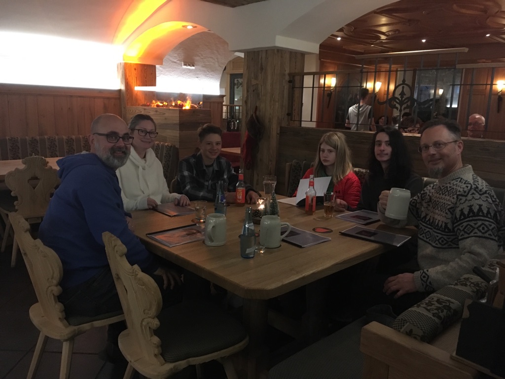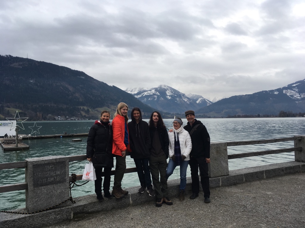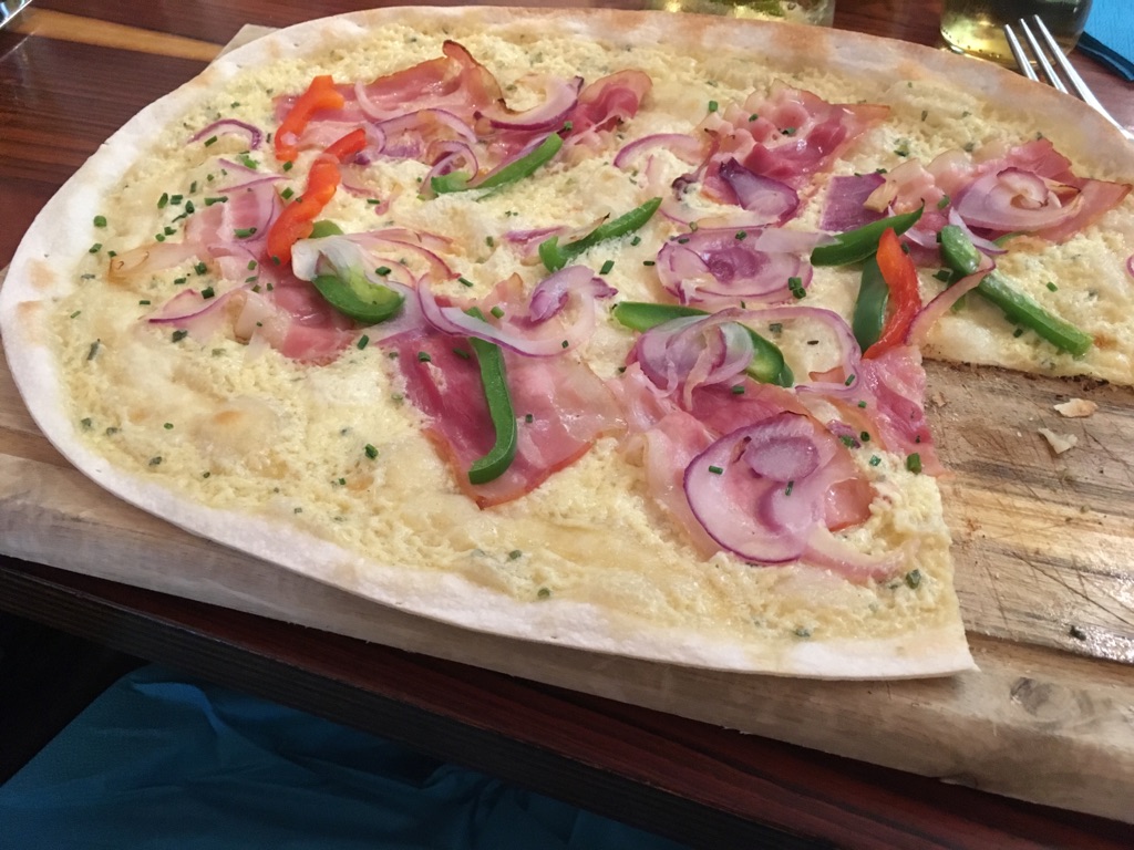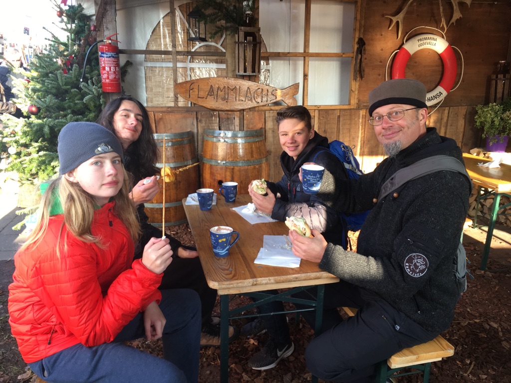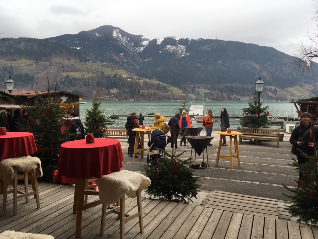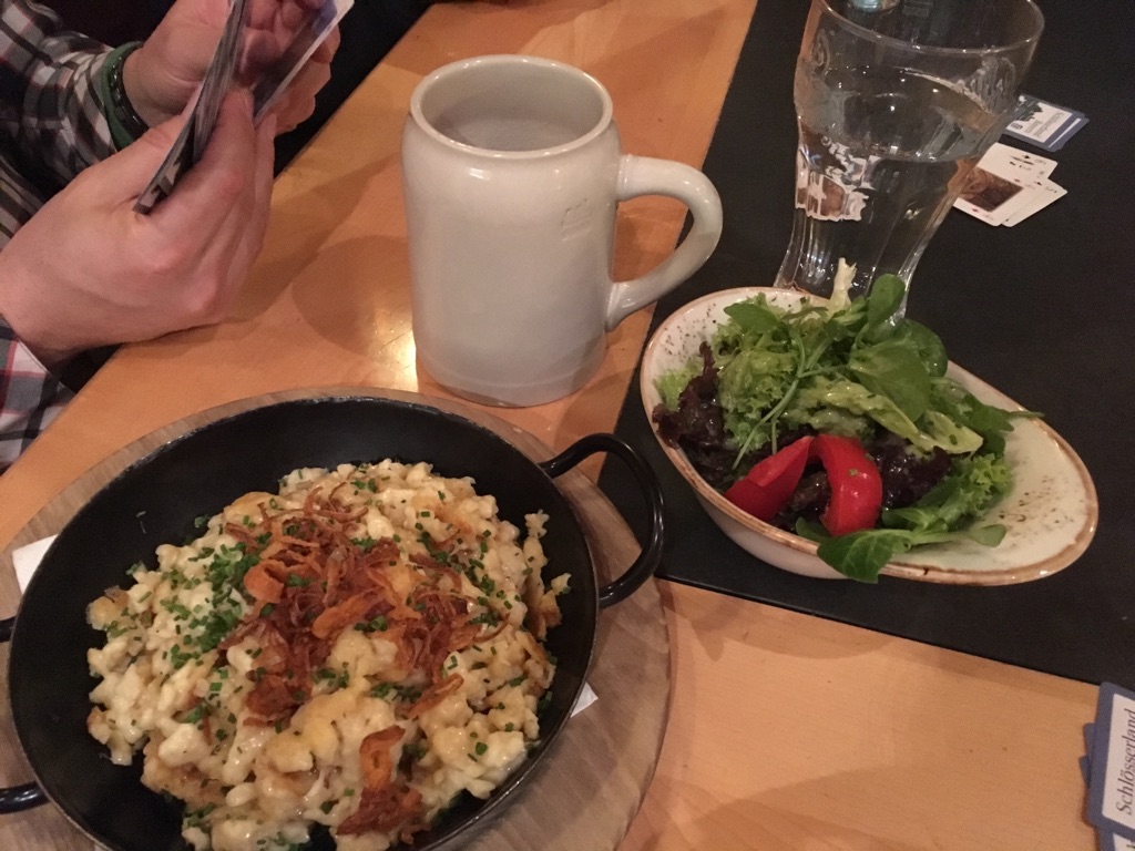 After the coaster we found a place to park in the village of Zell am See and began to walk toward the lake and the main part of town to find a restaurant, take pictures of the lake, and hit the Christmas markets. \240We chose a restaurant that served local Austrian food and a variety of other items. \240Me, James, and Carole ordered something that said it came with bacon and cheese. \240Liam ordered some sort of spinach dumpling, Dan had the fish special, Andrew got fried rice, and Ben had the burger. \240When mine came out I was very surprised that it looked like a white pizza on flat bread. \240Liam’s was a bread, spinach dumpling. \240The food was delicious. \240We all enjoyed our meals very much. \240