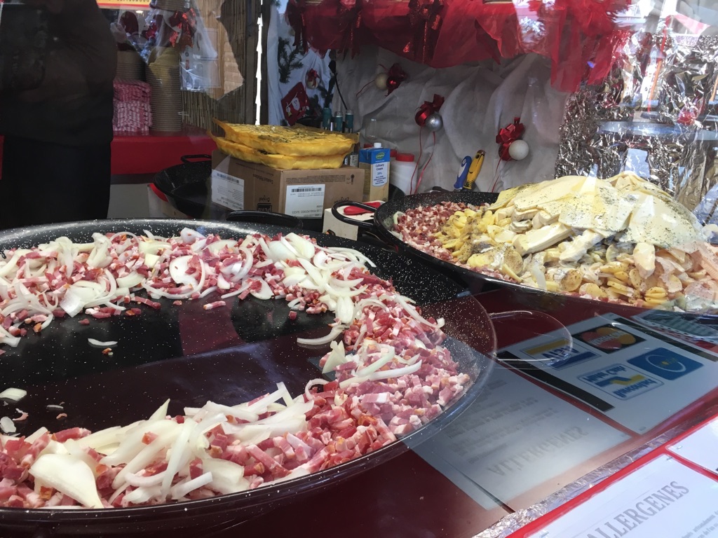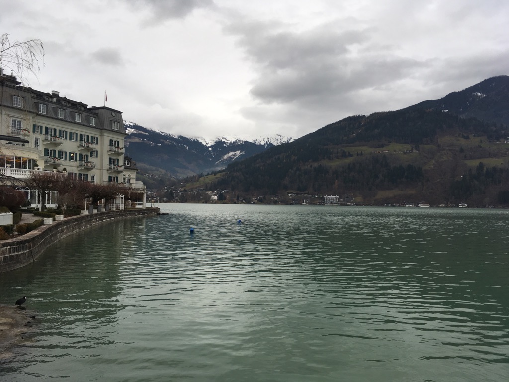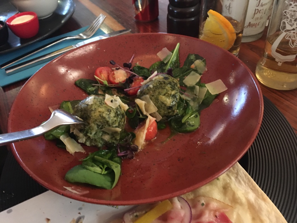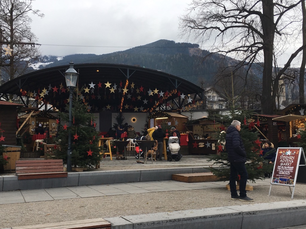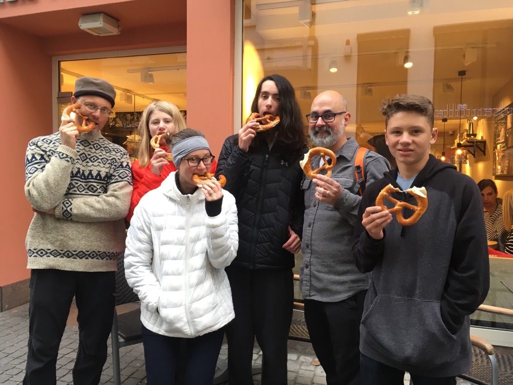 After the coaster we found a place to park in the village of Zell am See and began to walk toward the lake and the main part of town to find a restaurant, take pictures of the lake, and hit the Christmas markets. \240We chose a restaurant that served local Austrian food and a variety of other items. \240Me, James, and Carole ordered something that said it came with bacon and cheese. \240Liam ordered some sort of spinach dumpling, Dan had the fish special, Andrew got fried rice, and Ben had the burger. \240When mine came out I was very surprised that it looked like a white pizza on flat bread. \240Liam’s was a bread, spinach dumpling. \240The food was delicious. \240We all enjoyed our meals very much. \240