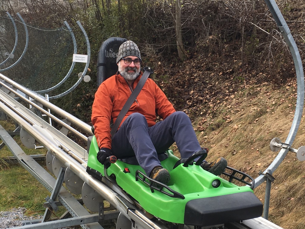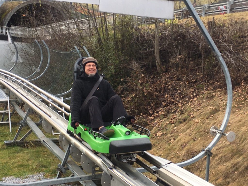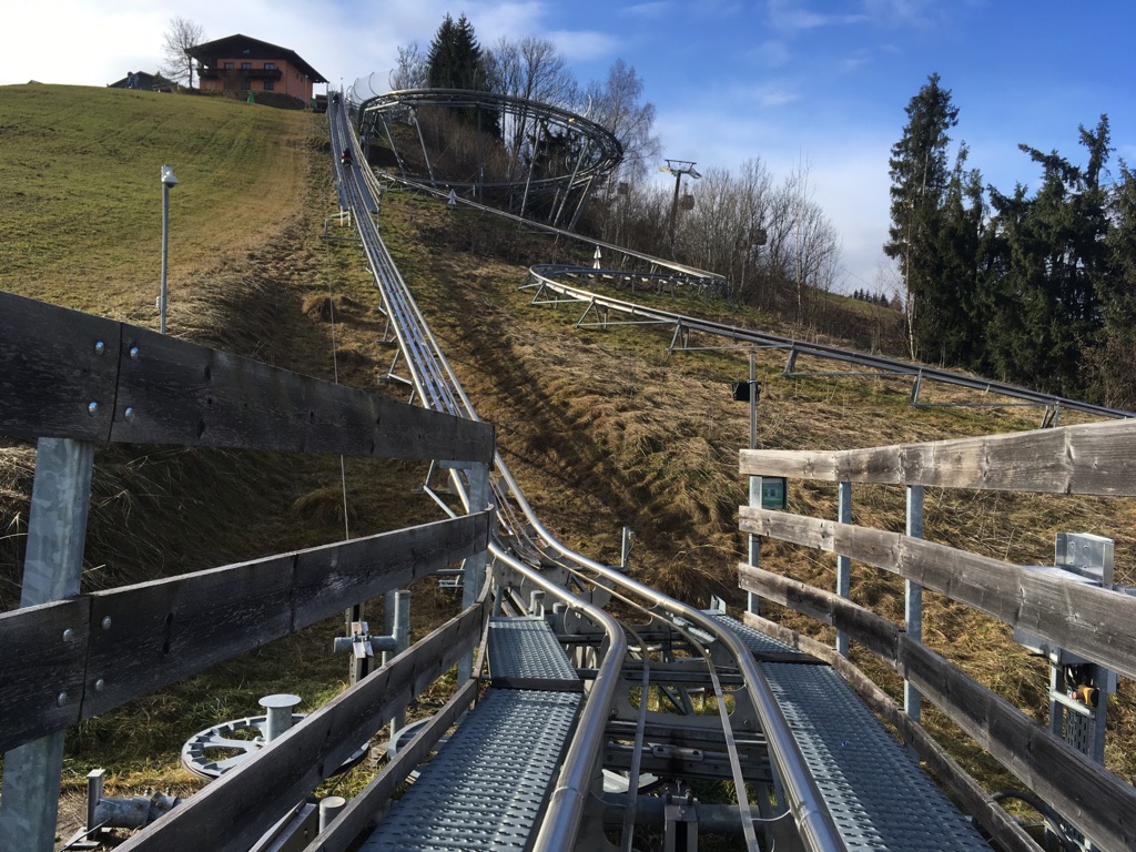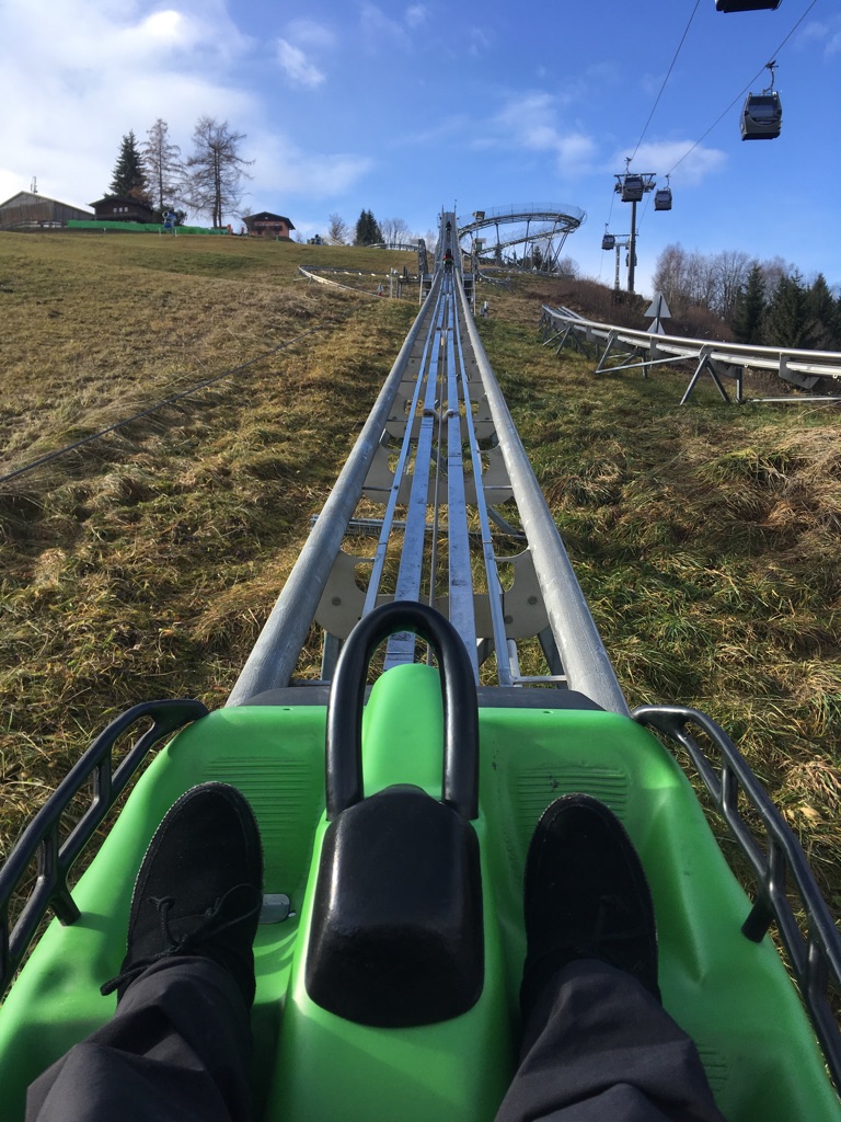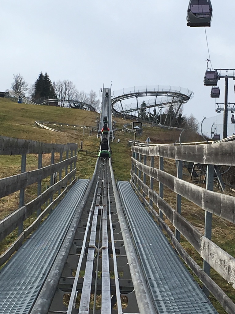 The sled slowly climbed the track as I sat there in frightened anticipation. \240What happened if I don’t break properly? \240What happened if it flies off of the track? \240Ahhh! \240I was nervous but also really excited. \240My sled was still climbing and I could see Liam with a big smile on his face as he zoomed down the track spiraling down toward the bottom. \240All too soon it was my turn and the sled stopped at the top. \240What now? \240I pushed the break lever forward and it began to go over the apex and down I went! \240I was very timid and used the break lever quite a bit. \240It was a blast! \240I flew down cork-screw spiraling, over undulating track and dove beneath the coaster structure itself. \240When I reached the bottom I was really glad we all had 2 more runs to do. \240Next time I wasn’t going to be so heavy with the break!