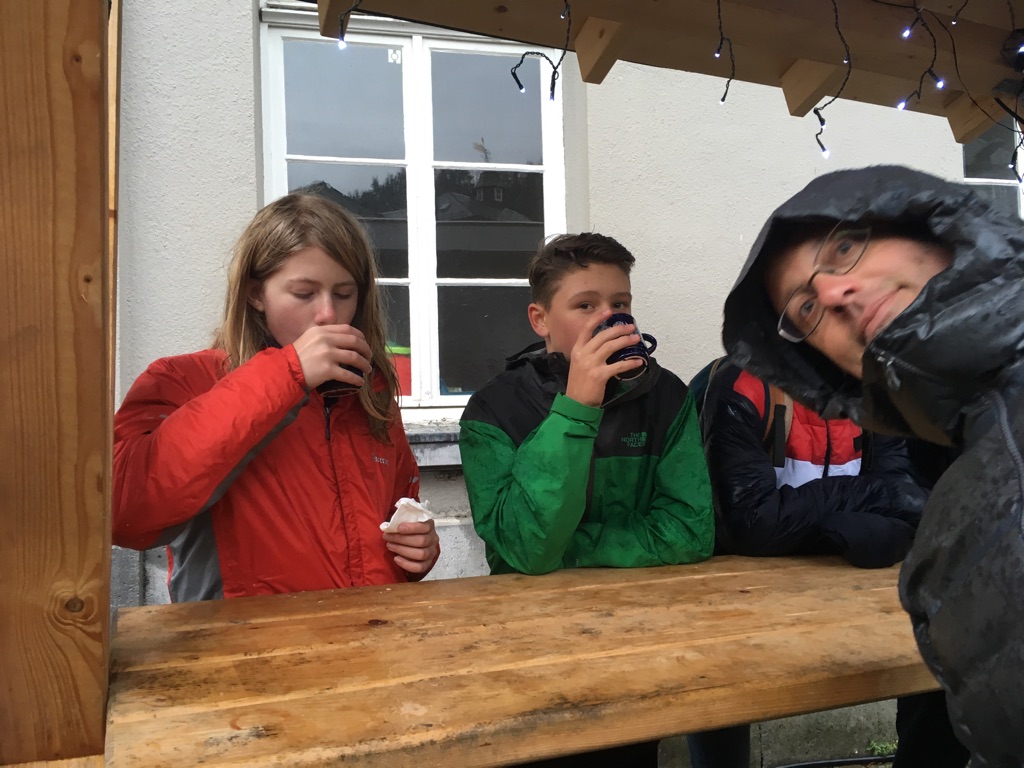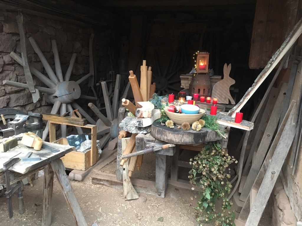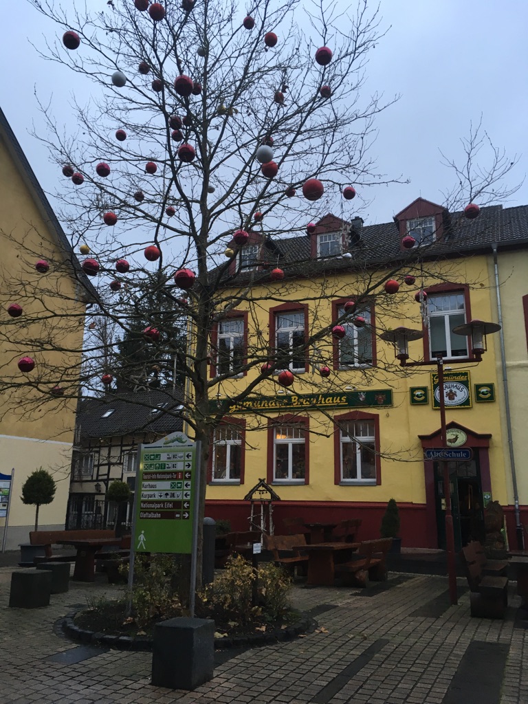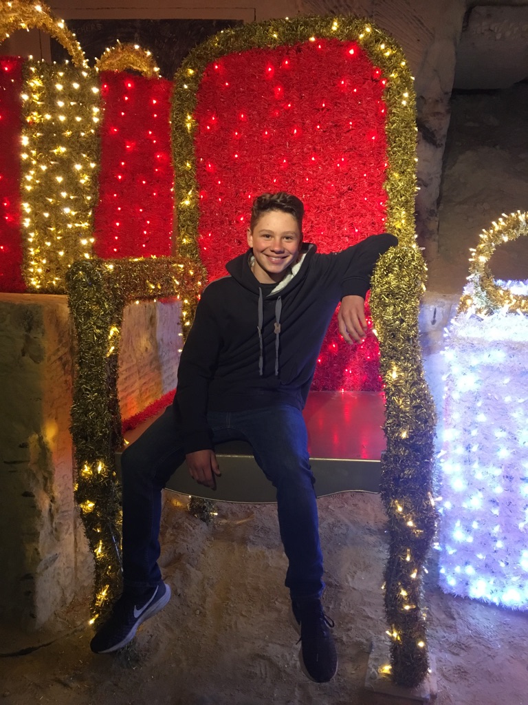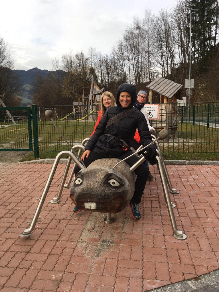 We walked through the St Johann christmas Market and hit the Gluwein stand first thing. \240This market actually had some different food items for sale and some unique wares. \240I particularly like the hand carved Eidleweiss flower but didn’t have a euro bill small enough to purchase it and I was also worried about how I would get it home without breaking it. \240The market wasn’t too big and the boys were getting hungry so we decided to make our way to the restaurant where we had eaten on our first night here in St Johann. \240We were just about to leave when all of the sudden a huge ferocious beast with a large hairy body, a red face, pointed teeth, a big ugly tongue and huge horns came walking down the street toward the market! \240It was Krampus!! \240He came over to shake our hands and I really wanted to touch his teeth! \240He took a keen interest in Ben and he hit me with his switch. \240Better watch out and be good! \240Krampus will shove you in a sack and drag you off to the underworld! \240We were thrilled with this encounter as we have been discussing Krampus quite a bit over the past few days. \240