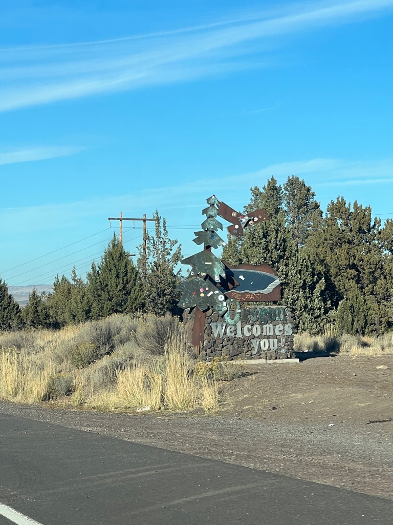 Crappy sign welcoming us to Oregon