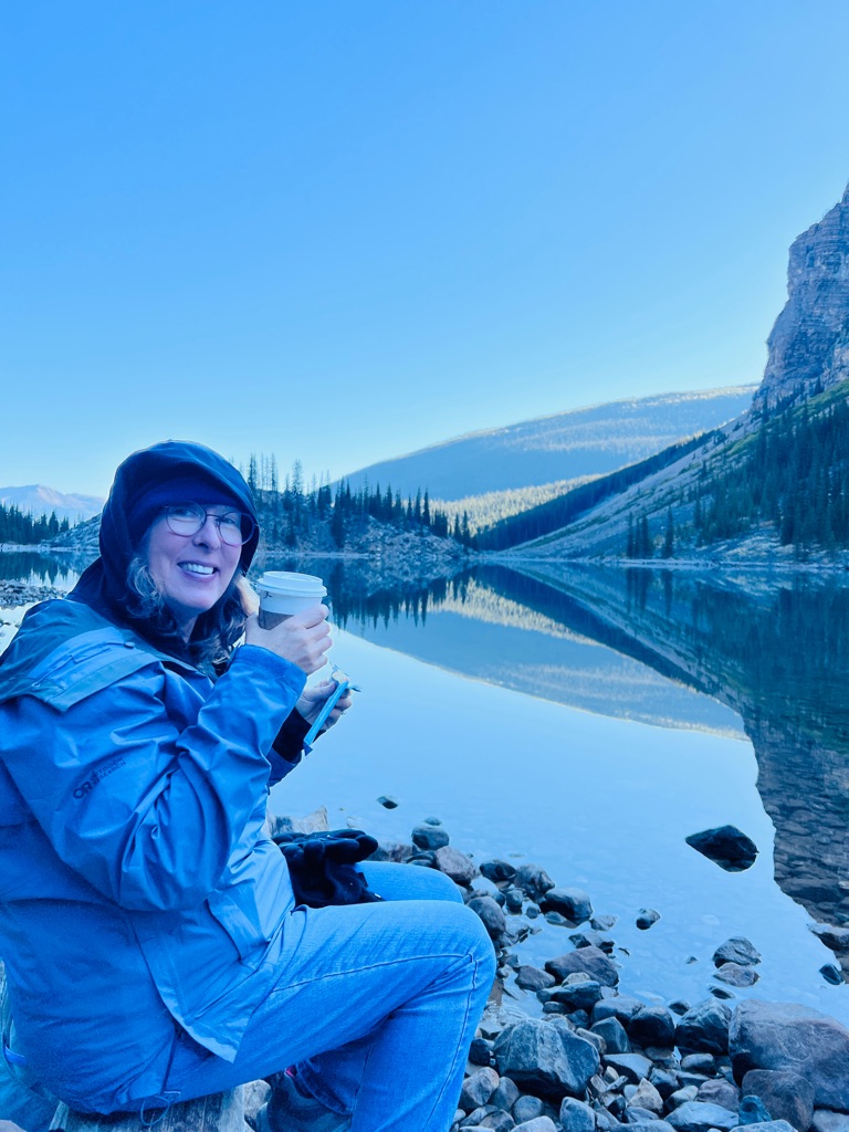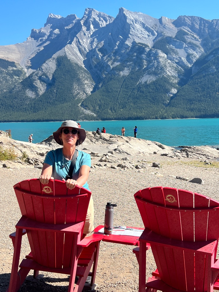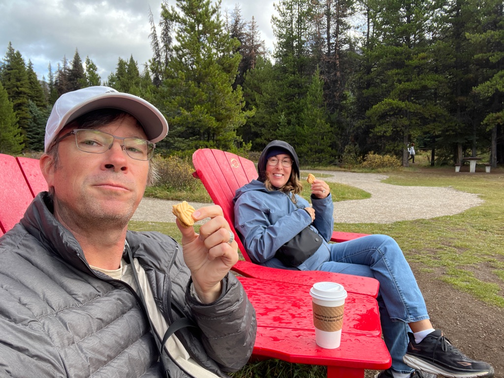 We found some more of the Canadian Parks red chairs at Maligne Lake. \240Coffee and a maple cookie for a snack
