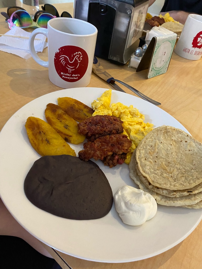 Huevos Ranchos (eggs in tomato sauce with beans and fried plantains)