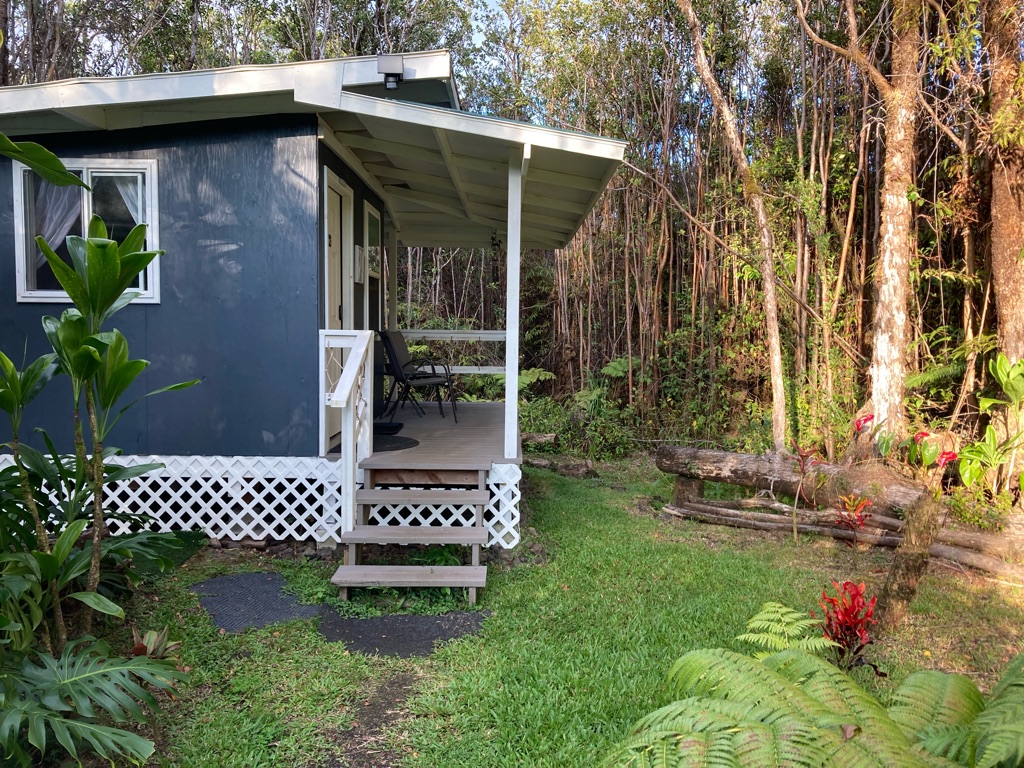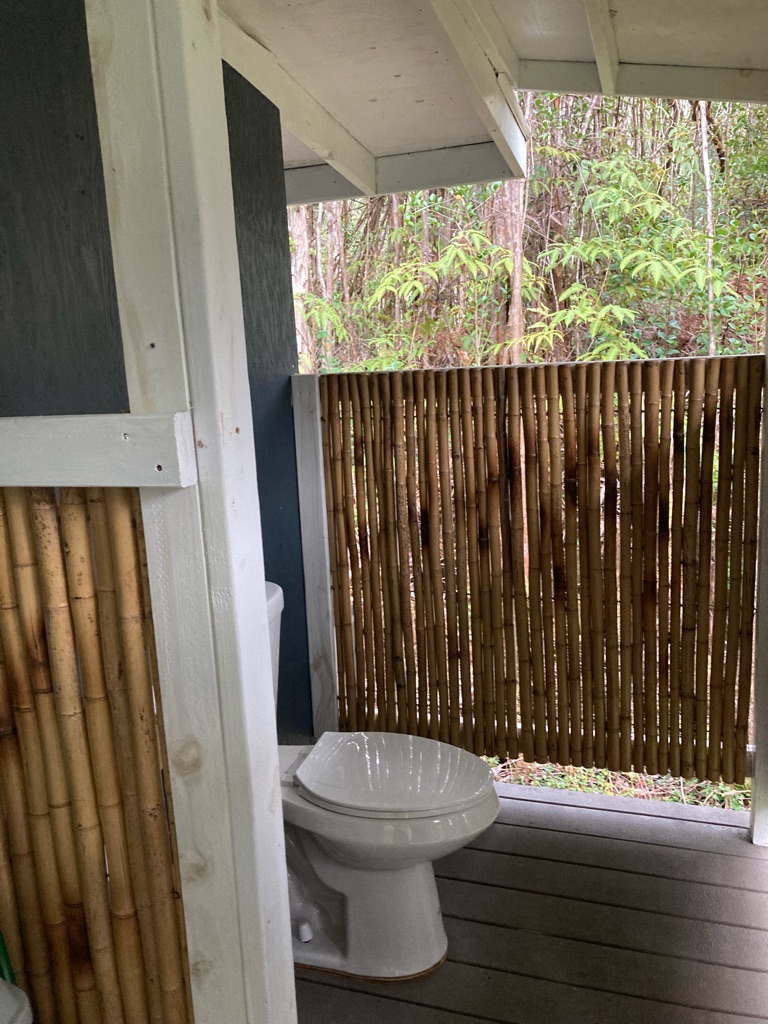 La douche, les toilettes et le lavabo sont dehors. Seul un lit se trouve dans la cabane et le micro onde et frigo se trouve dans le sous sol de la maison des propriétaires à côté