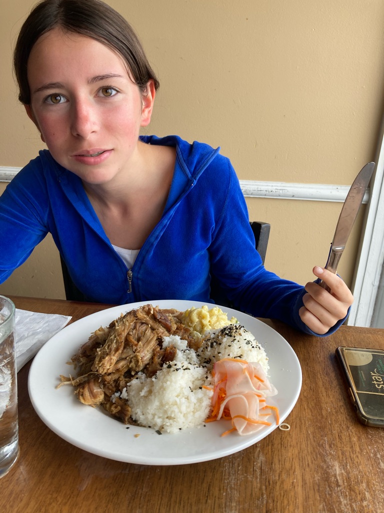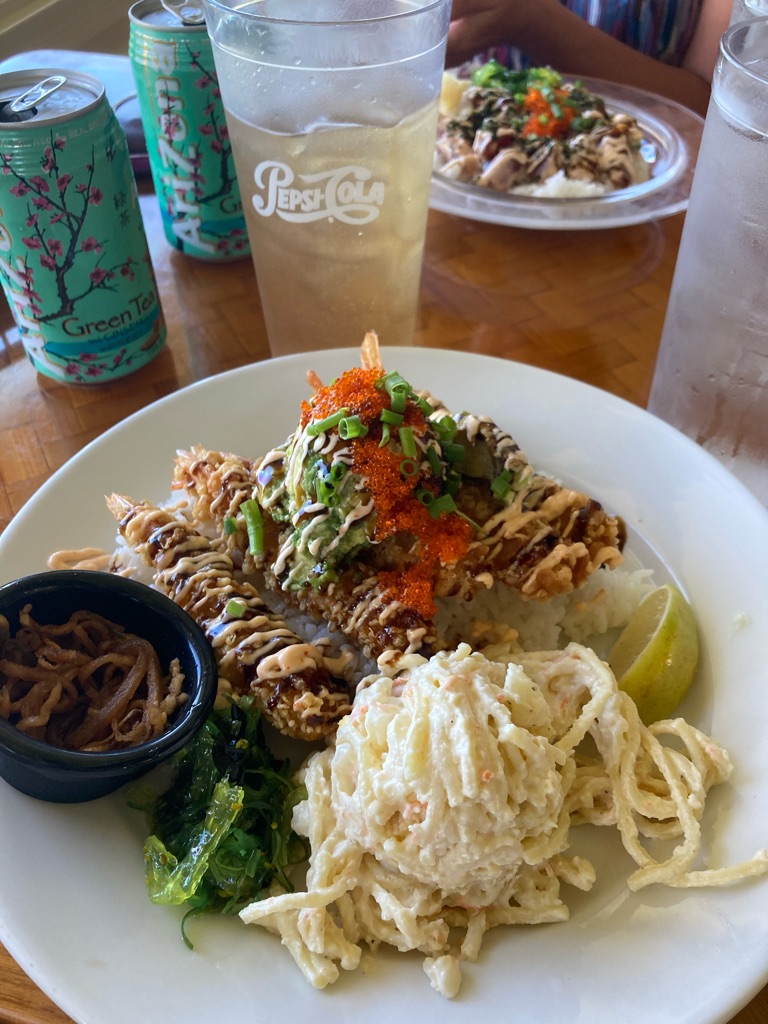Ils s’encombrent pas à Hawaï : au buffet tu te sers une fois et donc tu mets tous les plats dans une même assiette mais c’était trop bon et une occasion de goûter différents plats de l’île