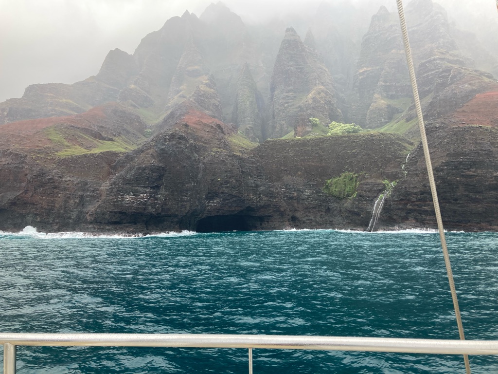 Et bien nous voilà revenu de notre petite escapade : alors comment vous dire .. on nous a vendu un super coucher de soleil sur la roche de la côte na’pali avec des couleurs époustouflantes avec un petit dîner pour patienter pendant le trajet retour et on a eu de la pluie et du coup une côte de n’a’pali pas toujours bien visible et Margaux avec le mal de mer au bout de 2 heures donc par solidarité je n’ai pas mangé et elle non plus 🤣🤣