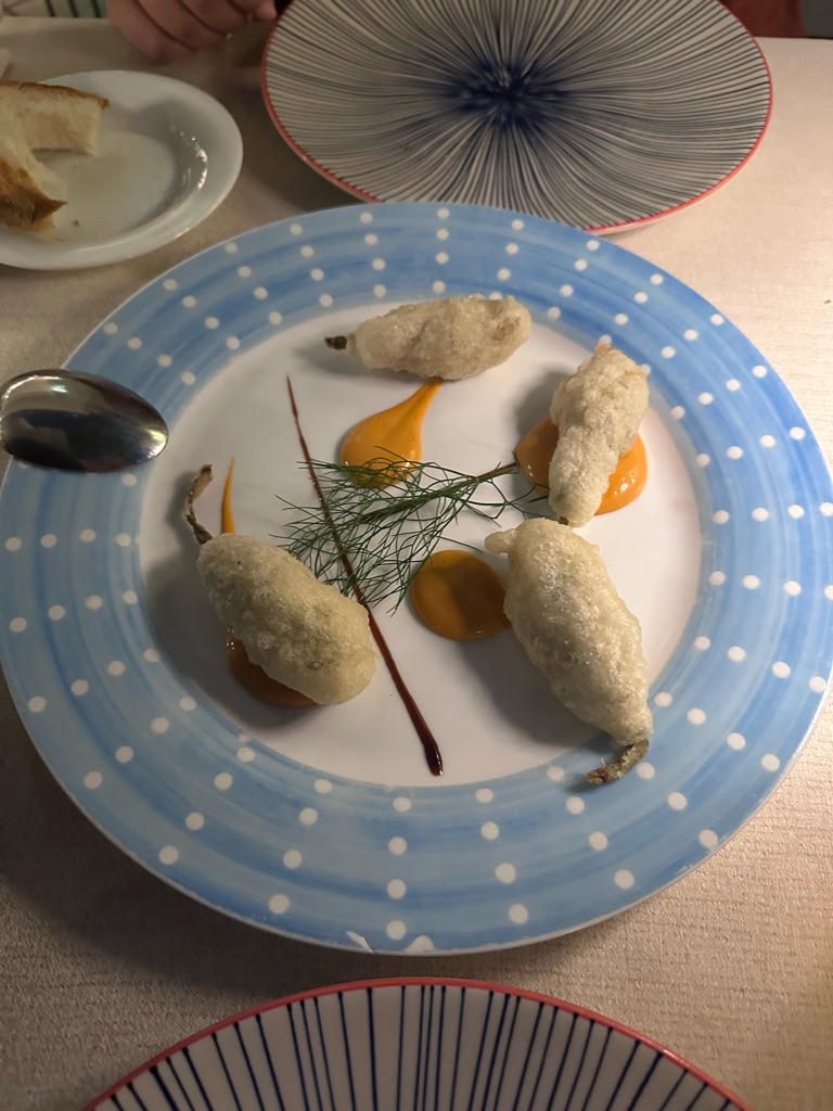 Tempura fried zucchini flowers stuffed with ricotta, and herbs with a tomato sauce