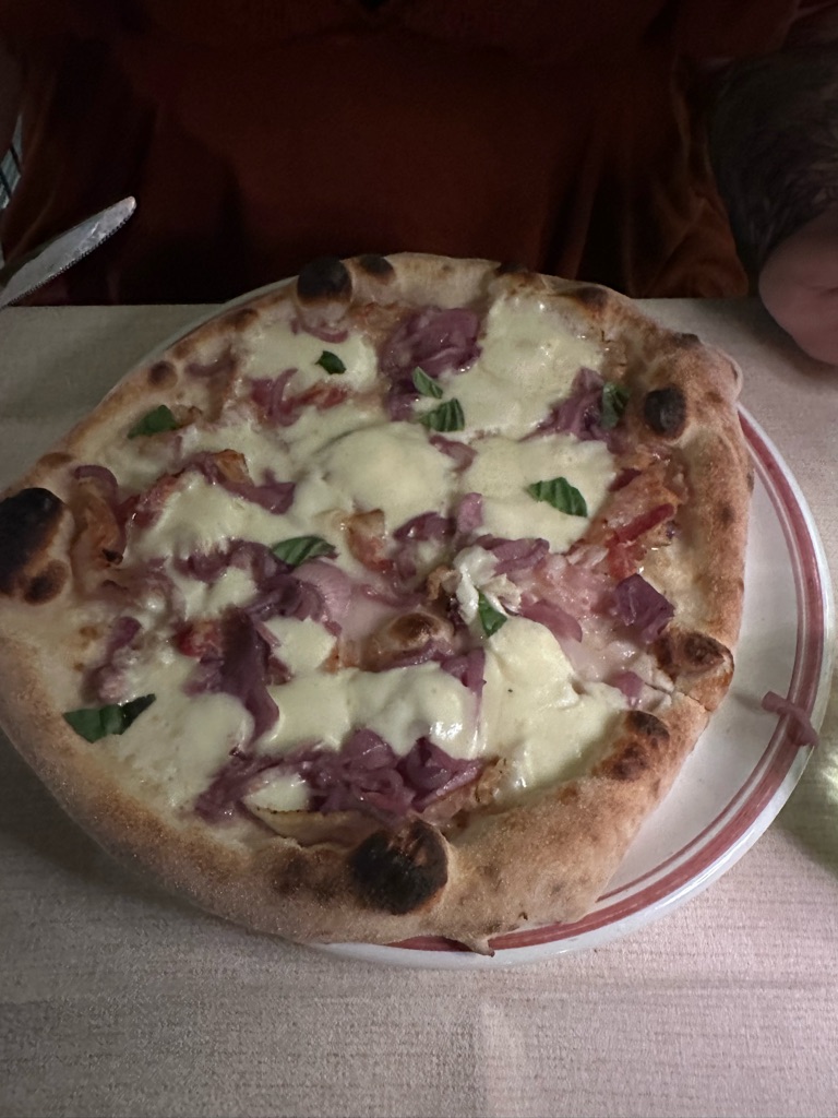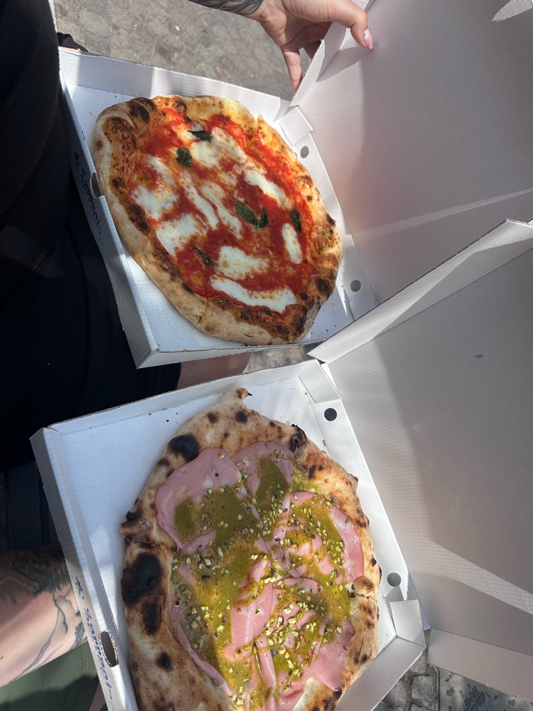 Our Lunch consisted of Pizza; Sarah got the Margharita, and I got Mortadella E Pistachio