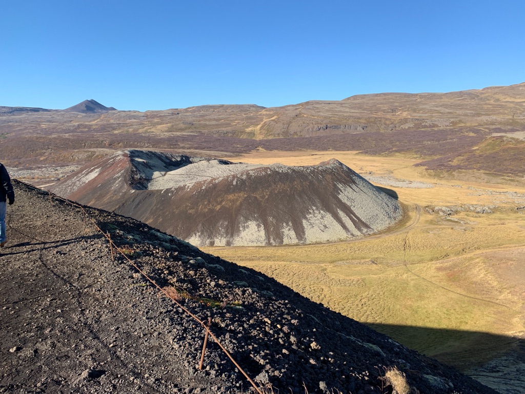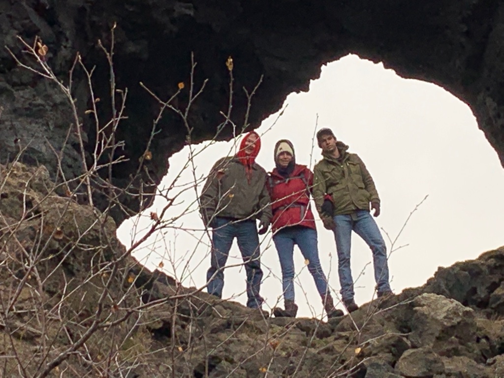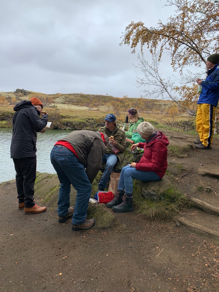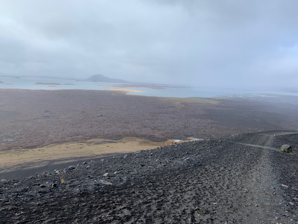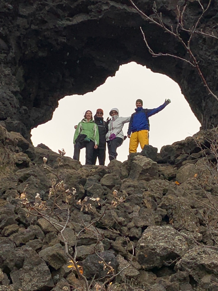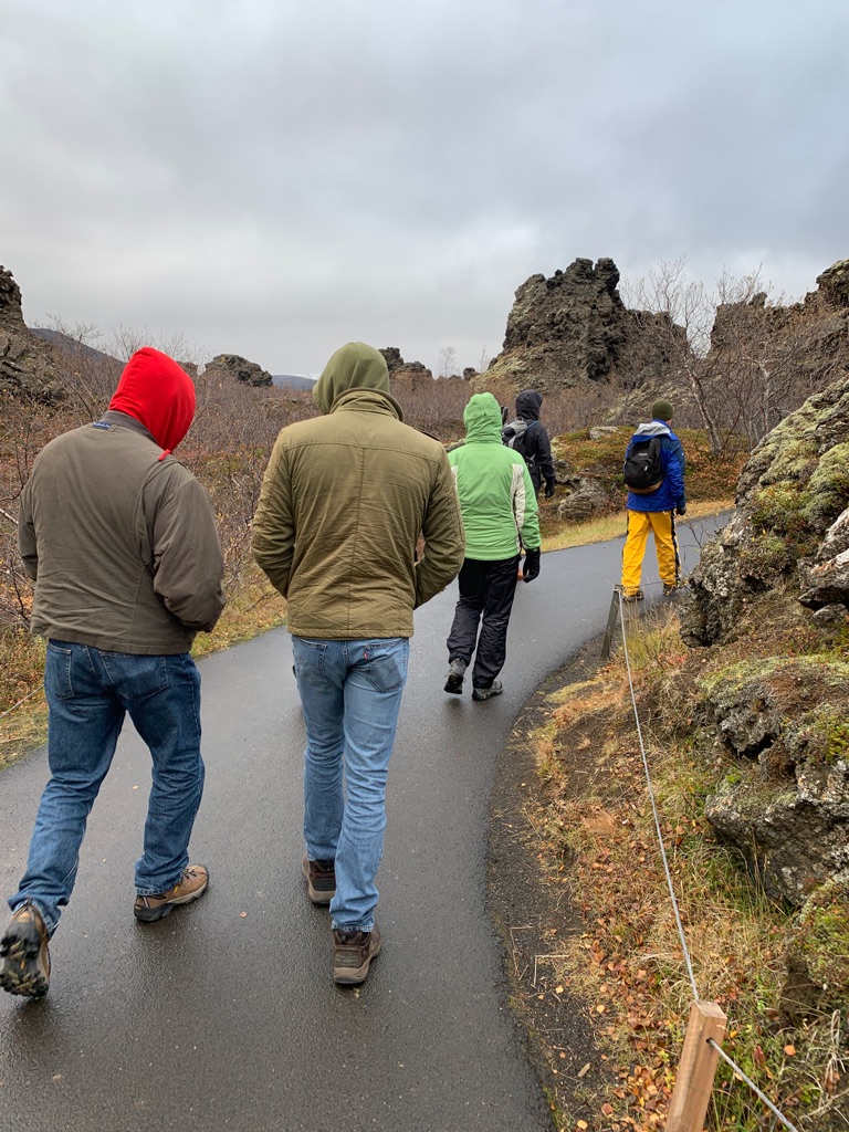 So today as stated ended up being at Dimmulborgir after a grocery stop for lunch supplies. This area and the second stop where we had lunch were Wildling Army Camp scenes in GoT. \240Then we went to Hverfjall. Steep climb up the hill and super windy and cold. I opted not to hike whole crater rim but ended up barely being back before the rest of the crew was. After that, we definitely needed a break. Which was convenient as we had tickets for Myvatn Nature Baths. Lindsay opted out but the rest of us enjoyed it. Sure wish we had more time to try out more of the geothermal spas. It was very soothing and relaxing. One of the couples we met was from Carlsbad.