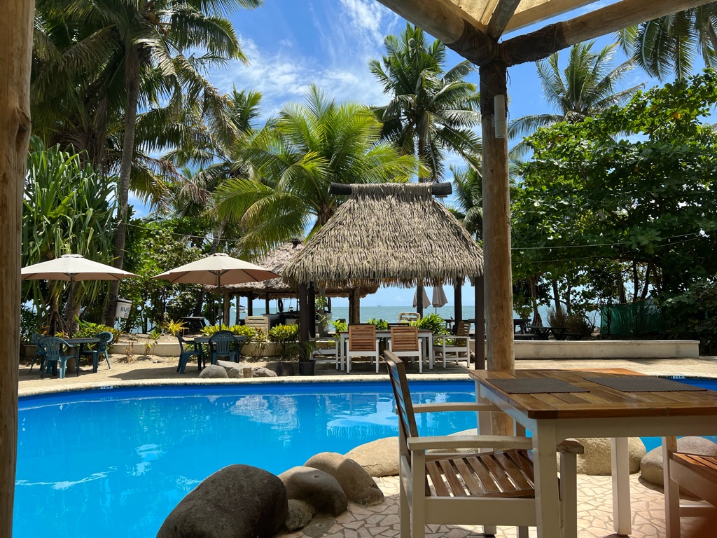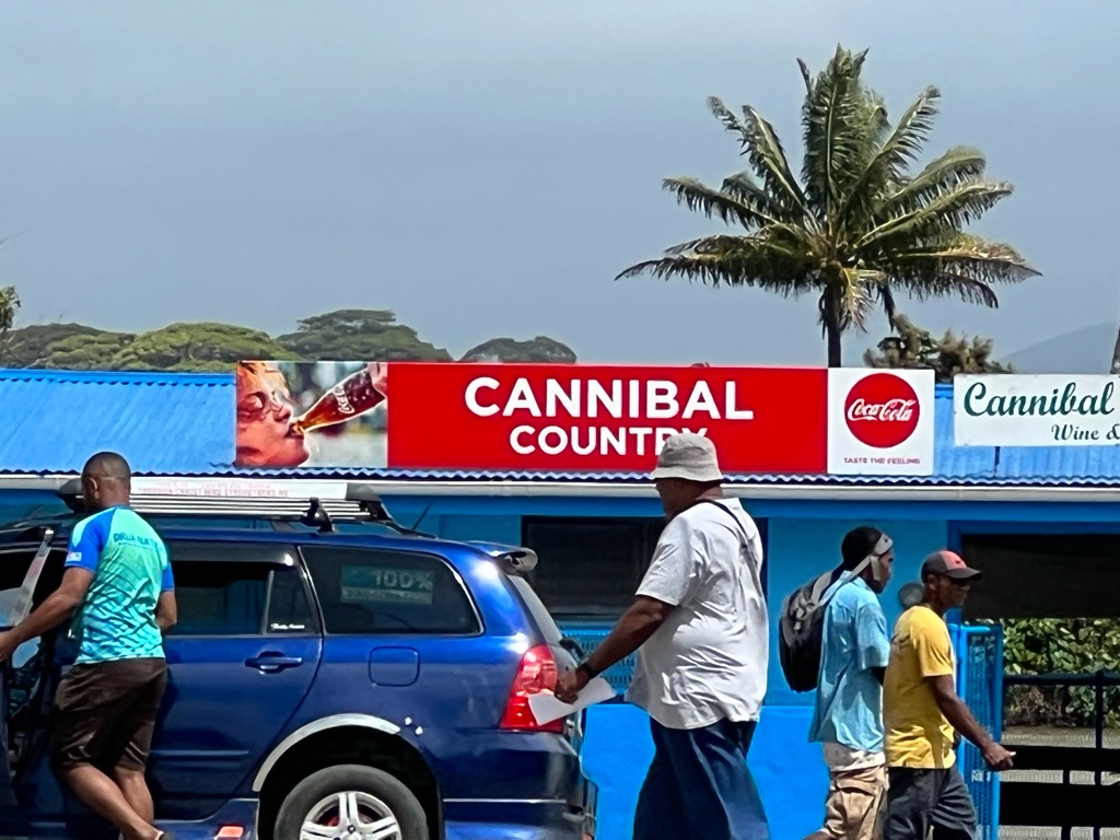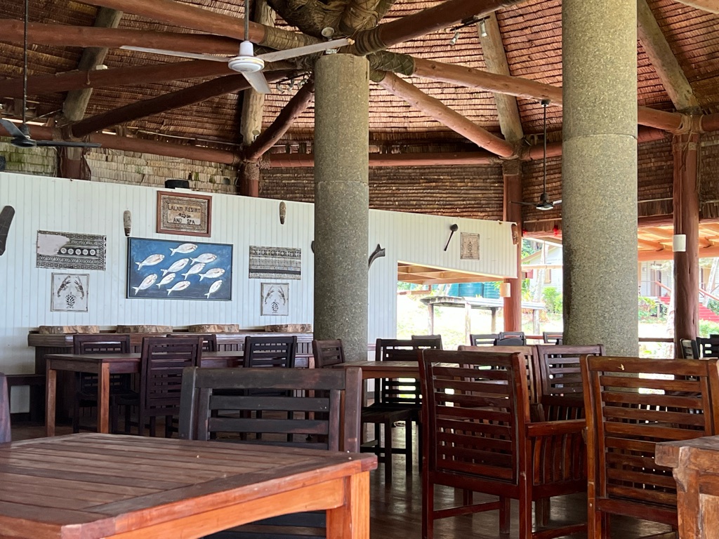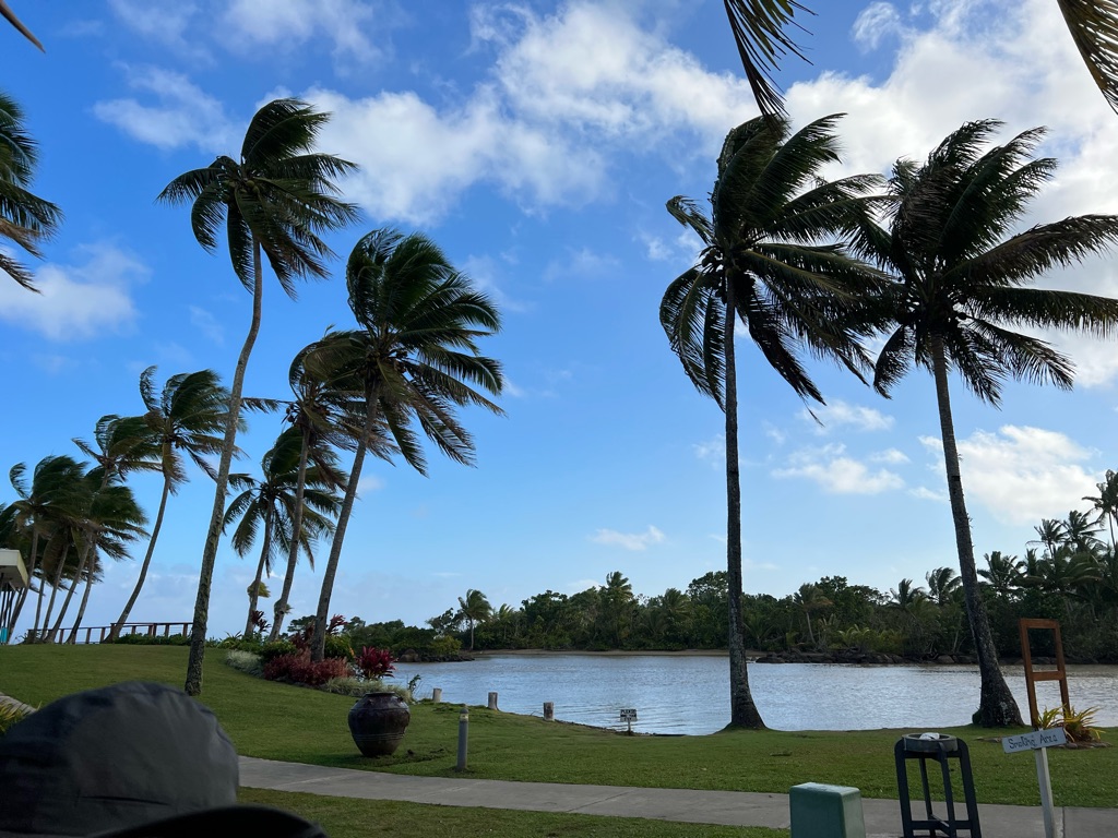 Next morning everyone was up to change bedding,clean,pack and/or change berths. Kellie is very specific about how she wants the boat to look when guests arrive. Then we had to move the boat to the dock. Another hairy proposition that they hadn’t done before. After a tense half hour or so, we were docked with the island bar right behind the boat. Celebrated with breakfast at the cafe. Lindsay and I finally made the decision we were going to eat the cost of the place in Nadi and see if we could get at room at the resort and then take the ferry and straight to the airport. It was a great plan and still don’t regret it, but expected to get in our room by 1 and spend some time in the ocean and pool. But, Fiji time….we got n to our room at 3:30. So short pool swim and then hot showers - except no hot water. Linds ran to tell the front desk and then to the boat to tell Kellie, no hot water but the blow dryer did work. While we were waiting for Kellie to do her hair, Linds and I were sitting outside and started seeing these little frogs hoping all over the grass. \240Went to dinner at Dicks, very close to our bungalow. It is a buffet style dinner place, not usually a fan but they were roasting suckling pig in a pit with hard wood. Super yummy. Plus there was bonus entertainment.