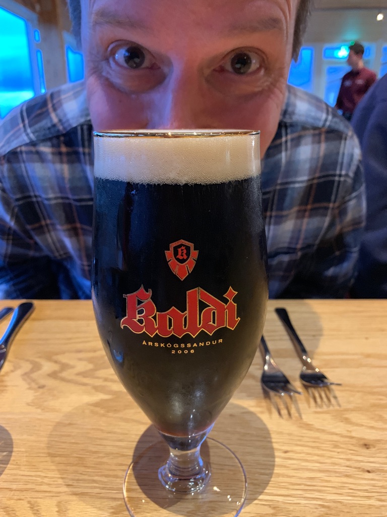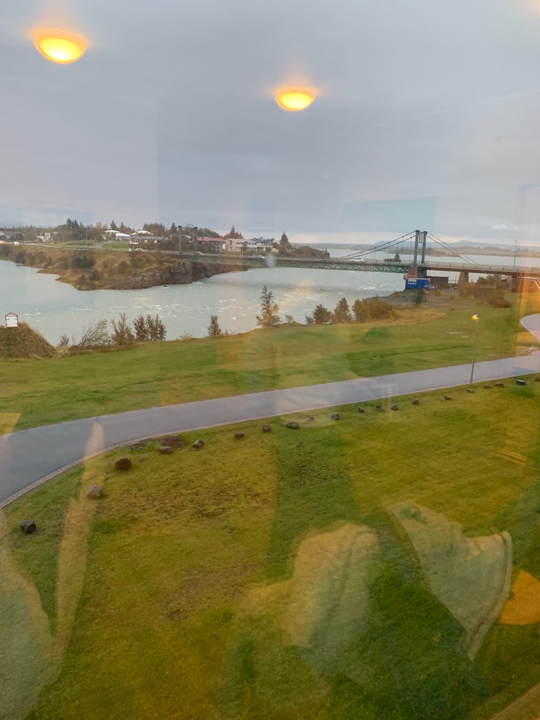 Lots of rain in to Selfoss and only had a little glitch right near the hotel. Our room is lovely with a view of the river, a bridge and a church. Had some drinks and a little dinner and then a planning session for tomorrow in our room.