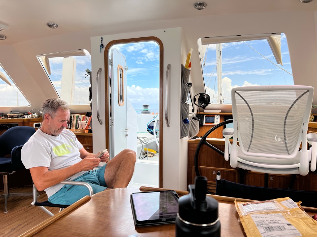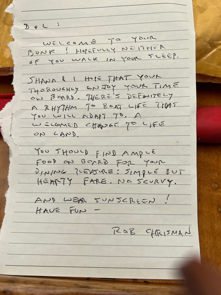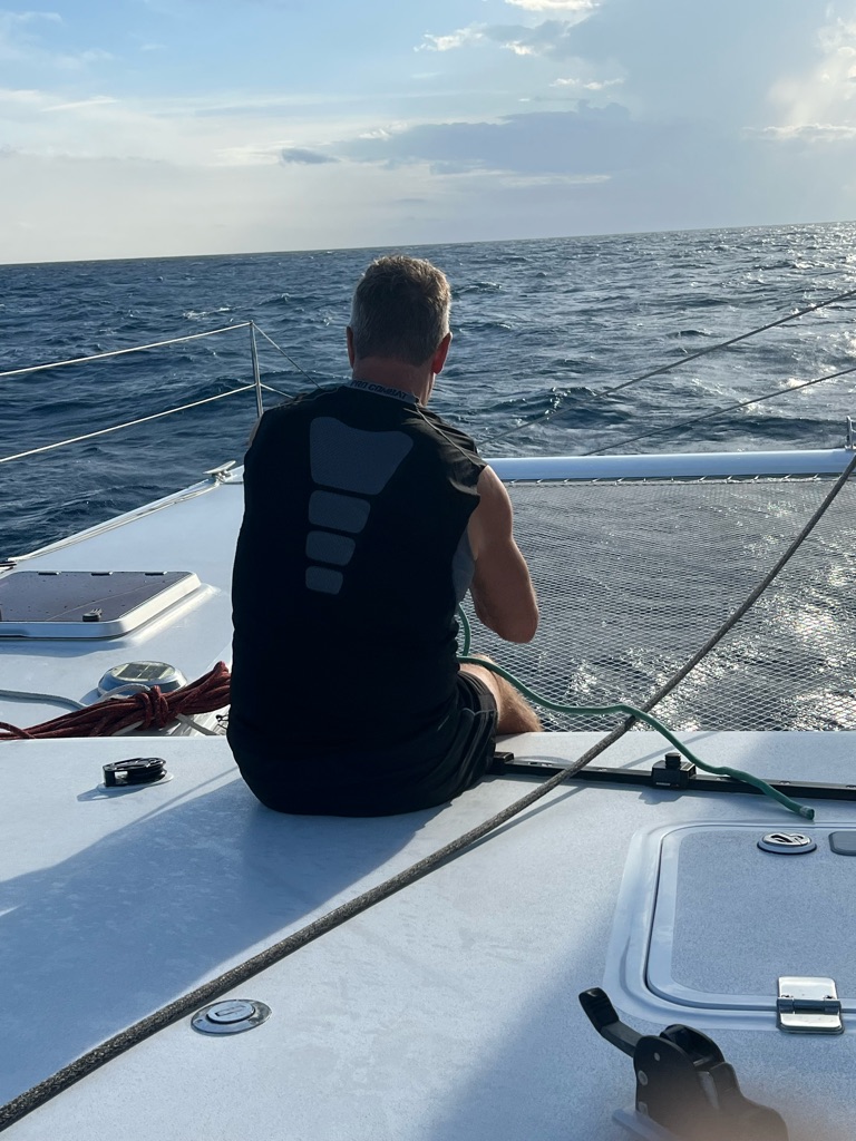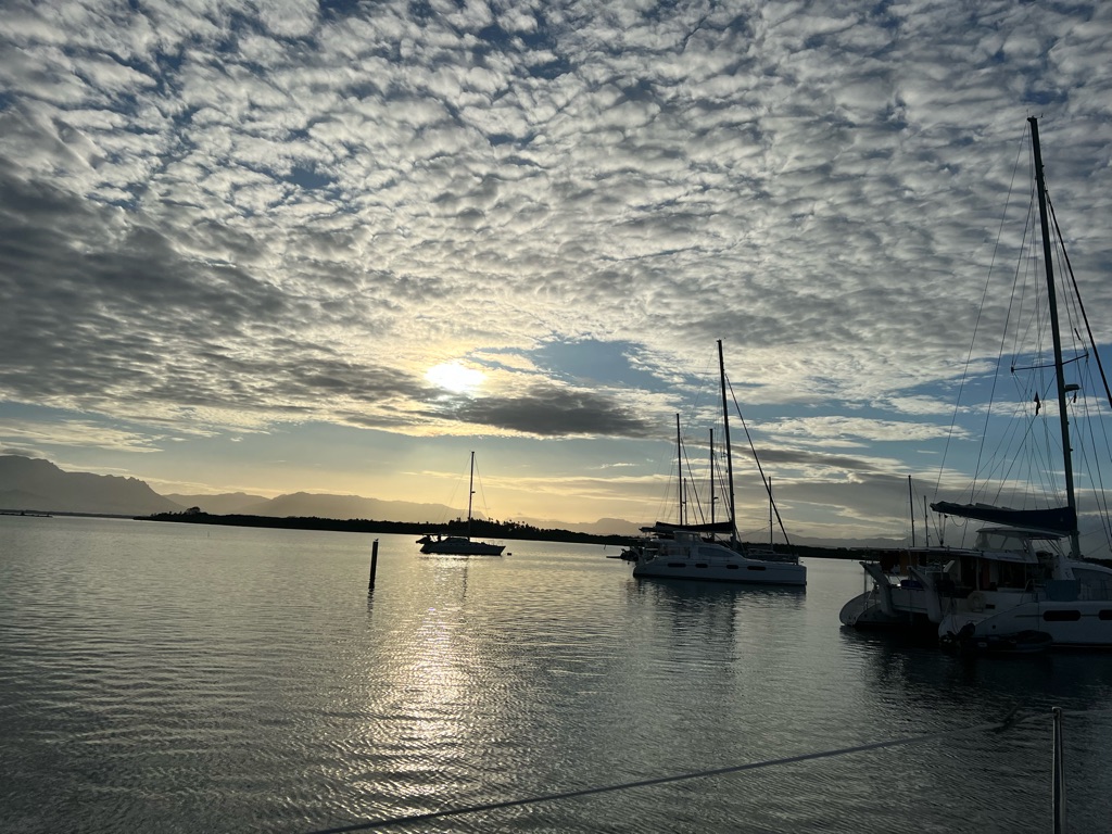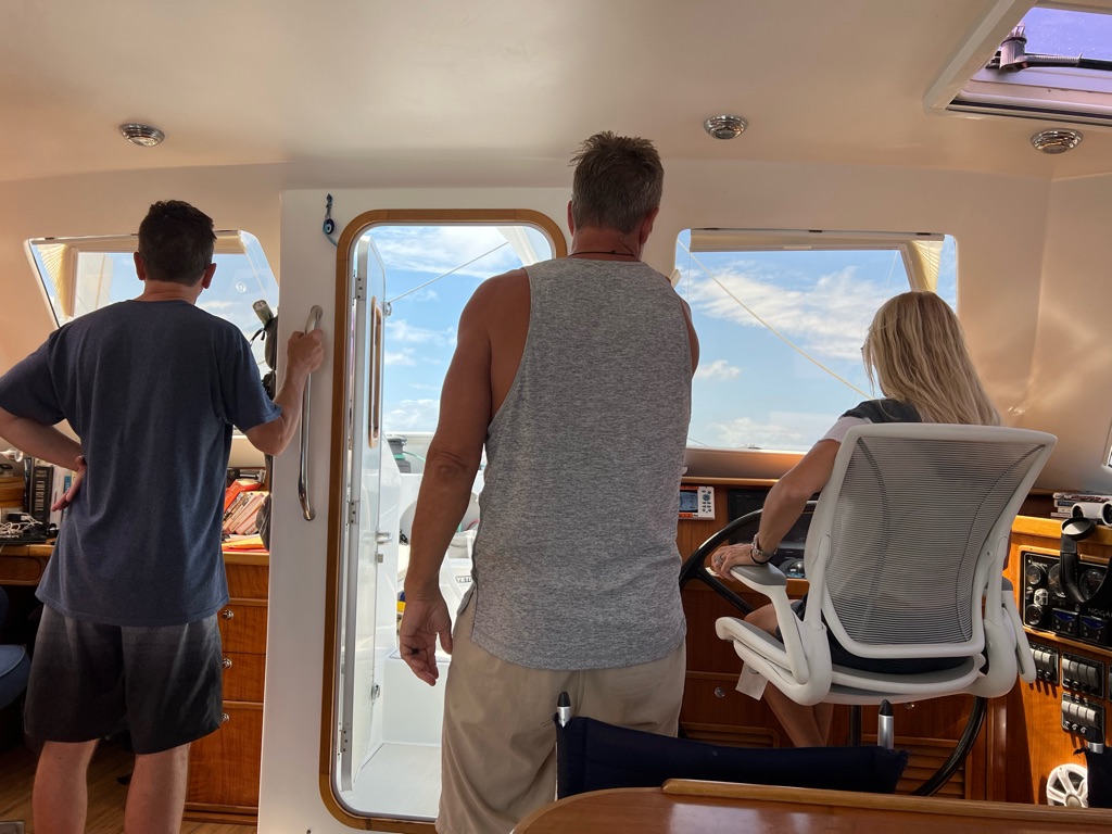 Rough night last night. It was calm til all of a sudden it wasn’t. \240By the time the evening was over,I had puked 2x. We watched “Blue Lagoon” on the stern and that certainly didn’t help. Watching pitching seas while on the pitching seas was not a good option. I had first anchor watch and it was a struggle. I probably should have gone to bed and rested for a bit. The anchor took a dip on a different line on the chart and I was a little concerned but it wasn’t lower than the scribbles to left so I told Gigi to watch that when she came up for watch. Felt like I didn’t sleep at all but I thought that Rob and Gigi moved the boat so I guess I slept for a little while. Took a Bonine this morning - going to be a choppy all day sail. Then we have to get busy packing and get our berth ready for the next guests. Haven’t been able to reserve the ferry back to Nadi so hopefully that isn’t an issue. We fortunately have an extra day to work it out which Maude does not. She is on the flight we originally had back to LAX.