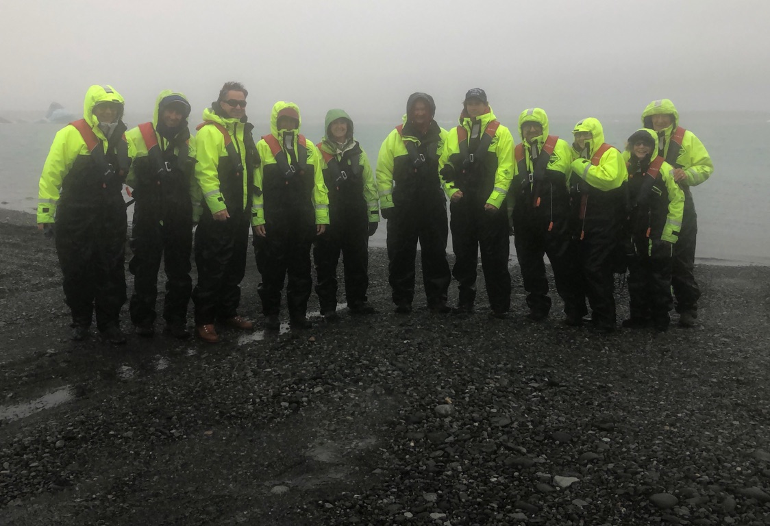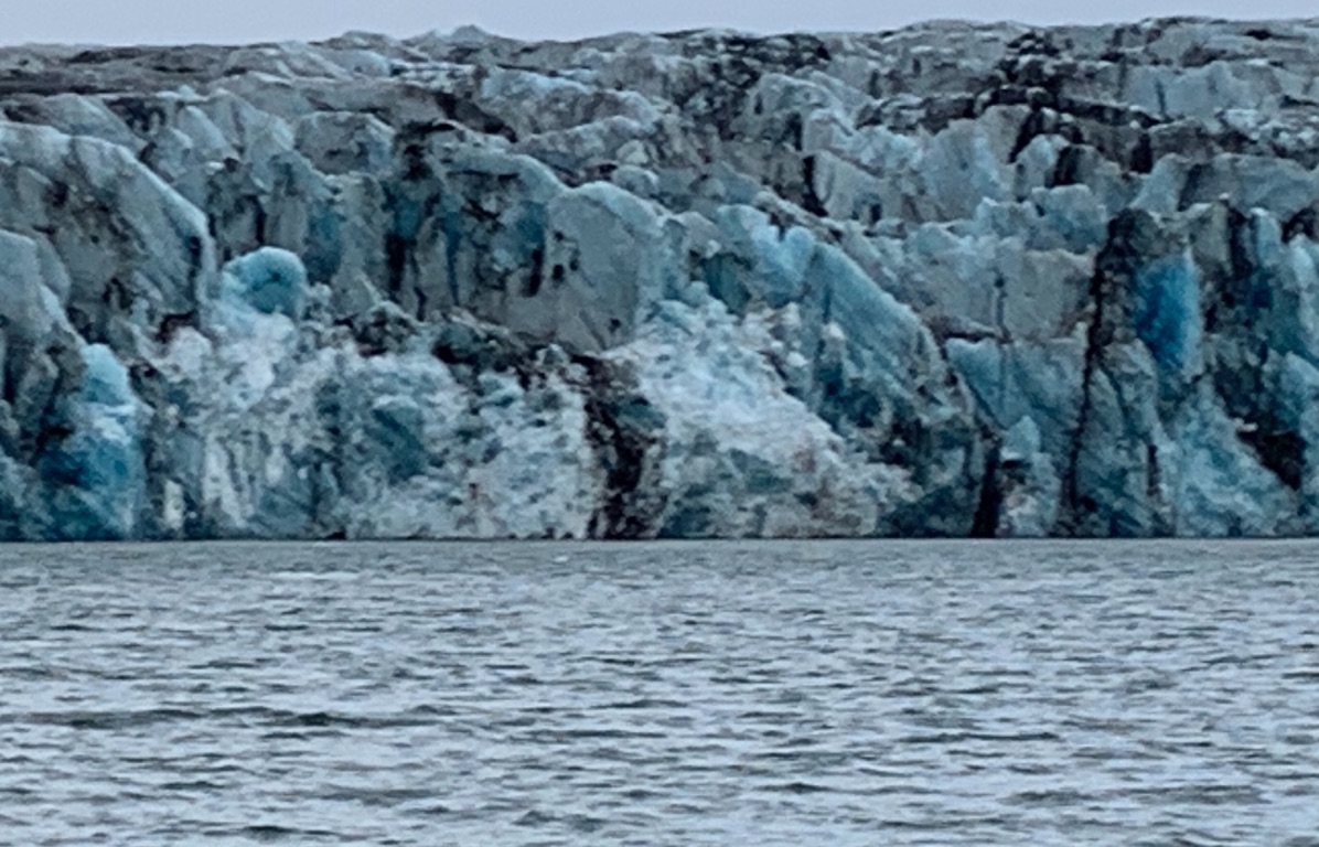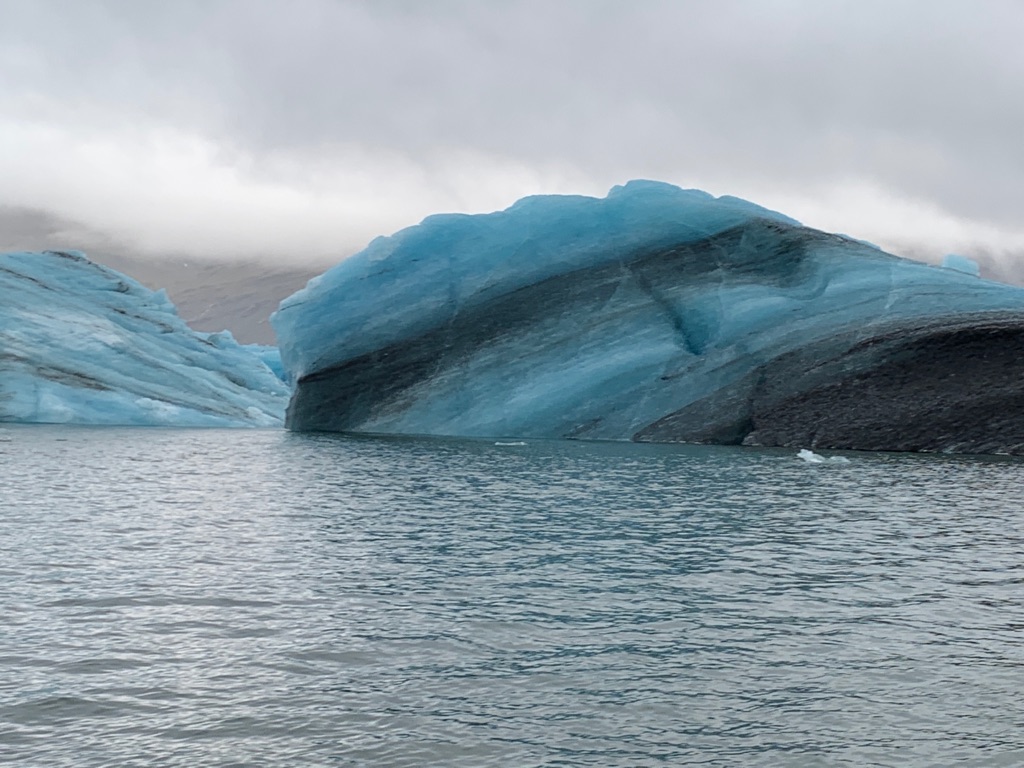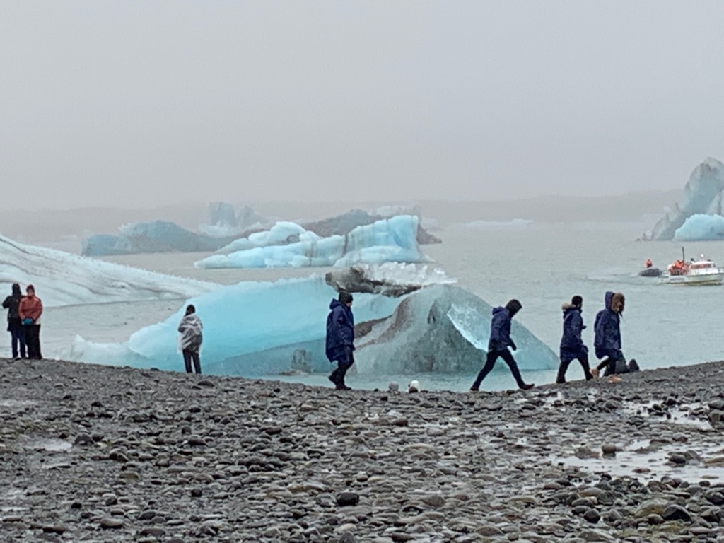 From there it was off to Svartifoss. We all split up and Linds, Luc and I did the waterfall hike and everyone else went toward the glacier. I came back down but Linds and Luc did an extended hike toward the glacier. Lunch was in the parking lot before another hour long ride to Diamond Beach. \240Did I mention it was raining off and on all day (and every day we have been here)? We had somewhat dried off from the Biebs hike, it had been pretty nice at the waterfall but it dumped again at the Beach and we had to put on wet flotation suits over our already wet clothes and coats, etc. Our Zodiac driver Attly was nice. And we saw some incredible icebergs. See the photos. We had dinner at a fabulous restaurant in Höfn that specialized in langoustine.