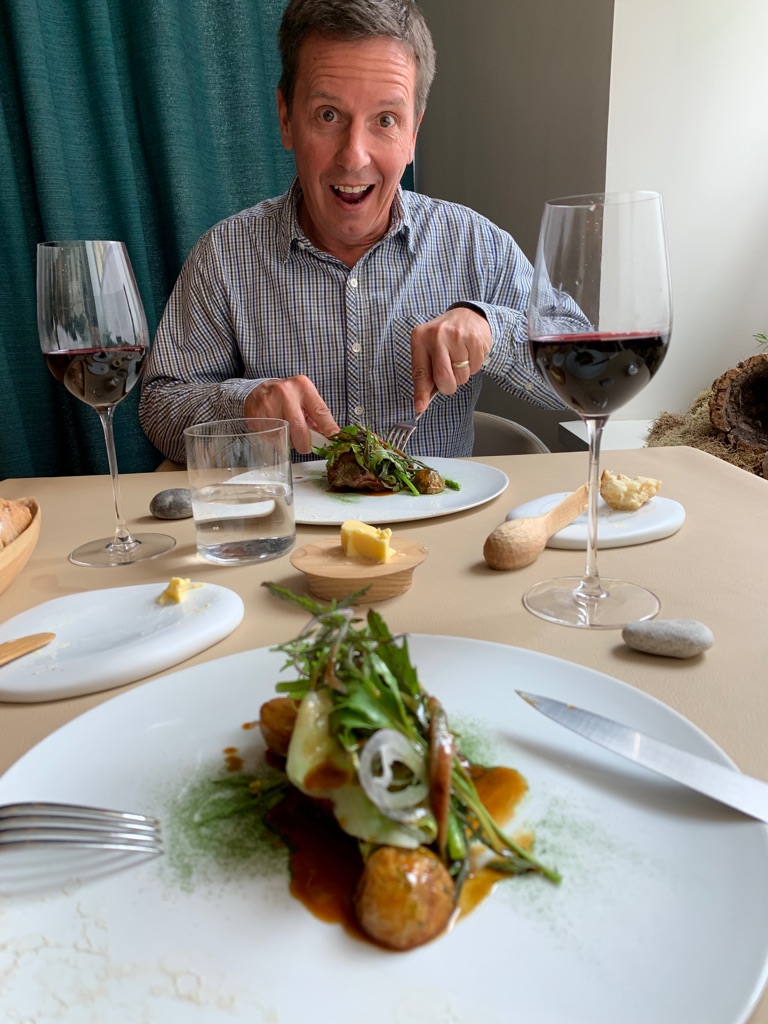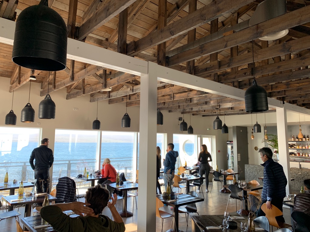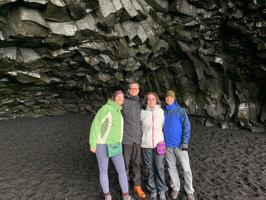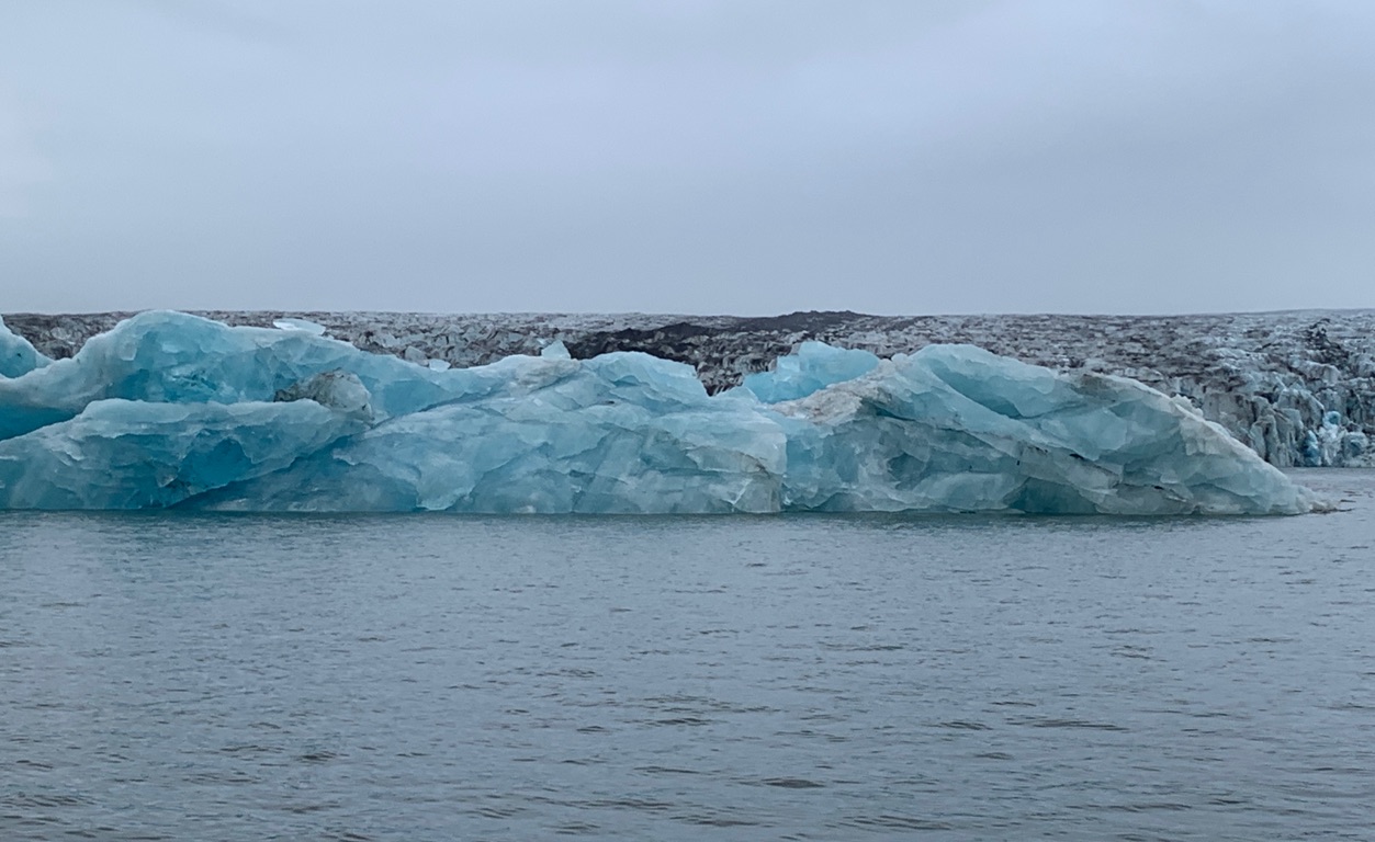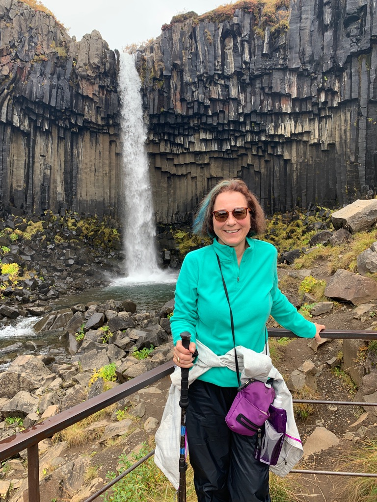 From there it was off to Svartifoss. We all split up and Linds, Luc and I did the waterfall hike and everyone else went toward the glacier. I came back down but Linds and Luc did an extended hike toward the glacier. Lunch was in the parking lot before another hour long ride to Diamond Beach. \240Did I mention it was raining off and on all day (and every day we have been here)? We had somewhat dried off from the Biebs hike, it had been pretty nice at the waterfall but it dumped again at the Beach and we had to put on wet flotation suits over our already wet clothes and coats, etc. Our Zodiac driver Attly was nice. And we saw some incredible icebergs. See the photos. We had dinner at a fabulous restaurant in Höfn that specialized in langoustine.