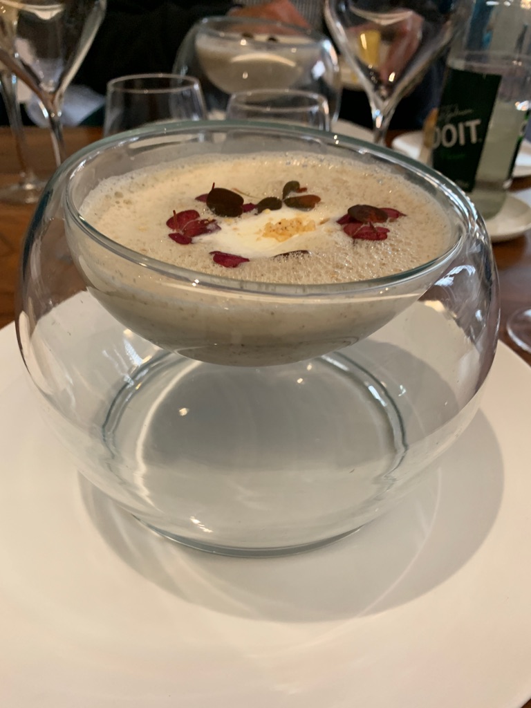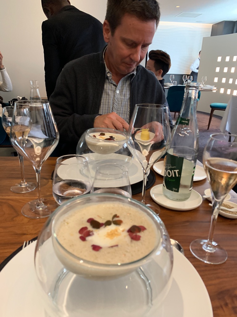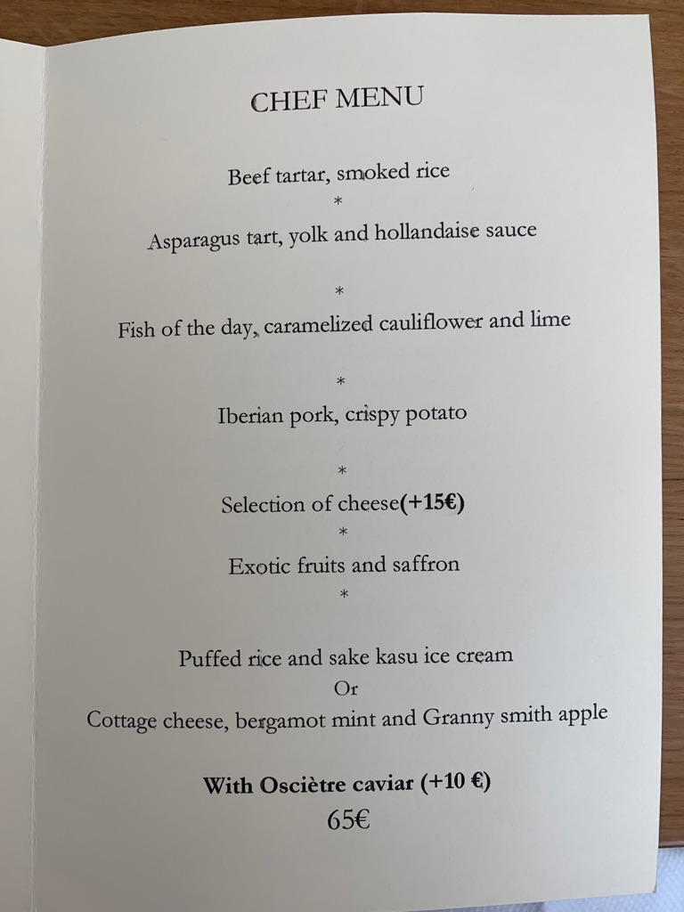Very nice at Le Montrachet. We had the April menu for 32€. \240Nice little amuse bouch with 4 little bites and then !wonton with mushrooms with mushroom broth. I had the asparagus entree, with candied trout for my main. \240And mango vinegrette for dessert. Super yummy. Kept thinking the bill sounded cheap and after I looked at it later - they didn’t charge us for the wine. Whoopsie! Bonus - so they eased the pain of the wine I bought at Pommard.