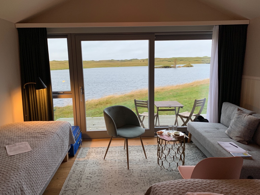 We spent the night at Magma Hotel. An upgrade from our original hotel. It was a great place. All separate little bungalows with a wall of windows and glass doors facing a lake of glacial water that comes from a stream that runs under the lava field. \240Only problem was we brought food and they didn’t like that. \240They did have a restaurant but I don’t even know if it would hold all the people that were staying there. We had stopped at grocery stores 2 days and bought things for lunches and dinner that night. It is amazingly expensive for food. I think we might spend as much for food as we did for the tour. \240Anyway, I think we cleaned it all up pretty well.