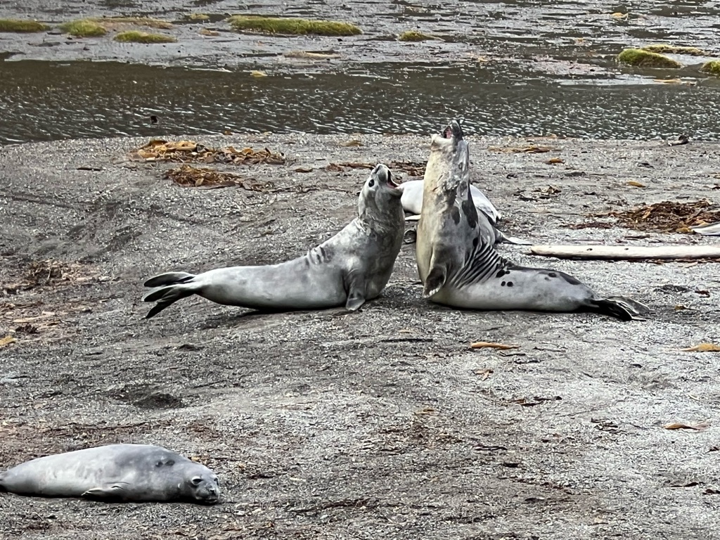 Today we went to Jackson Bay in Karukinka. Fairly far in the zodiacs, but dozens of elephant seals and a hike to a beautiful waterfall. Navigating through the driftwood was a little problematic, definitely mucky and when we got to the falls there was lots of scree. \240I should have not tried hiking up that. \240Had to kind of scoot down to a safer spot to stand. We were there for almost 3 hours. \240Came back to the ship and had a nice light lunch. We are now heading to Bahia Ainsworth where we hope to do a forest hike. Obviously much more to follow.