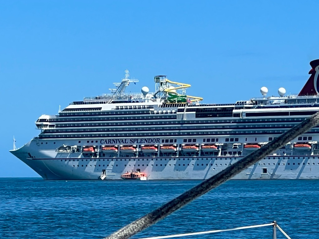 Later - I was sitting on the steps, legs in the water looking at fish. Got my clothes all wet to cool off. Very hot today. Not feeling like going ashore as it was brutal being dragged back in the boat yesterday. I am not strong enough to pull myself over the sides of the dingy. Anyway, finally get up to head on in and I see this big boat coming at us. A little disconcerting to say the least. Turns out it is this big ship - the Fiji princess and we are hoping they only stop here for the day. They sent out dingies to take chairs to put in the shade and they are dropping people off in 2 different spots. Our population of 25 just went to 125 at least and growing. Now there is a large private yacht that just pulled up also. So much for own private Idaho.